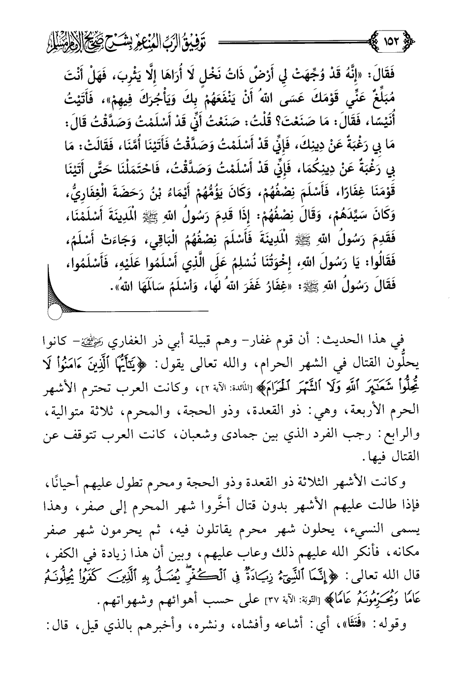 في هذا الحديث: أن قوم غفار- وهم قبيلة أبي ذر الغفاري رضي الله عنه- كانوا يحلُّون القتال في الشهر الحرام، والله تعالى يقول: {يَا أَيُّهَا الَّذِينَ آمَنُوا لا تُحِلُّوا شَعَائِرَ اللَّهِ وَلا الشَّهْرَ الْحَرَامَ}، وكانت العرب تحترم الأشهر الحرم الأربعة، وهي: ذو القعدة، وذو الحجة، والمحرم، ثلاثة متوالية، والرابع: رجب الفرد الذي بين جمادى وشعبان، كانت العرب تتوقف عن القتال فيها.