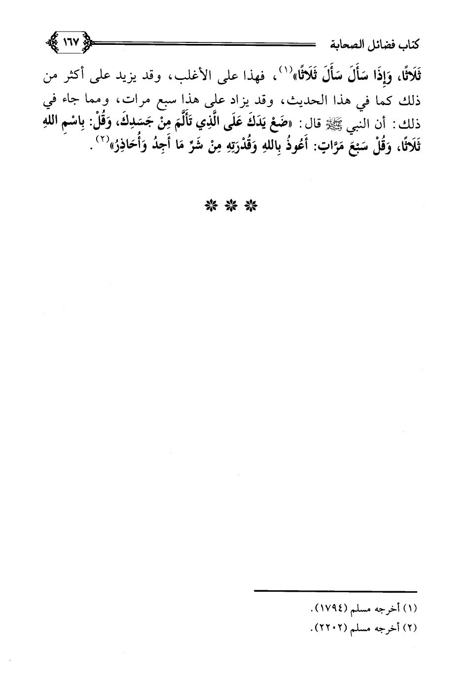 ثَلَاثًا، وَإِذَا سَأَلَ سَأَلَ ثَلَاثًا)) (¬١)، فهذا على الأغلب، وقد يزيد على أكثر من ذلك كما في هذا الحديث، وقد يزاد على هذا سبع مرات، ومما جاء في ذلك: أن النبي صلى الله عليه وسلم قال: ((ضَعْ يَدَكَ عَلَى الَّذِي تَأَلَّمَ مِنْ جَسَدِكَ، وَقُلْ: بِاسْمِ اللهِ ثَلَاثًا، وَقُلْ سَبْعَ مَرَّاتٍ: أَعُوذُ بِاللهِ وَقُدْرَتِهِ مِنْ شَرِّ مَا أَجِدُ وَأُحَاذِرُ)) (¬٢).