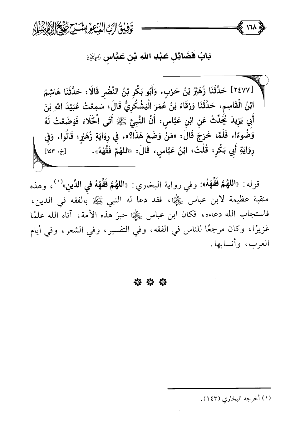 [٢٤٧٧] حَدَّثَنَا زُهَيْرُ بْنُ حَرْبٍ، وَأَبُو بَكْرِ بْنُ النَّضْرِ قَالَا: حَدَّثَنَا هَاشِمُ بْنُ الْقَاسِمِ، حَدَّثَنَا وَرْقَاءُ بْنُ عُمَرَ الْيَشْكُرِيُّ قَالَ: سَمِعْتُ عُبَيْدَ اللَّهِ بْنَ أَبِي يَزِيدَ يُحَدِّثُ عَنِ ابْنِ عَبَّاسٍ: أَنّ النَّبِيَّ صلى الله عليه وسلم أَتَى الْخَلَاءَ فَوَضَعْتُ لَهُ وَضُوءًا، فَلَمَّا خَرَجَ قَالَ: ((مَنْ وَضَعَ هَذَا؟ ))، فِي رِوَايَةِ زُهَيْرٍ: قَالُوا، وَفِي رِوَايَةِ أَبِي بَكْرٍ: قُلْتُ: ابْنُ عَبَّاسٍ، قَالَ: ((اللَّهُمَّ فَقِّهْهُ)).