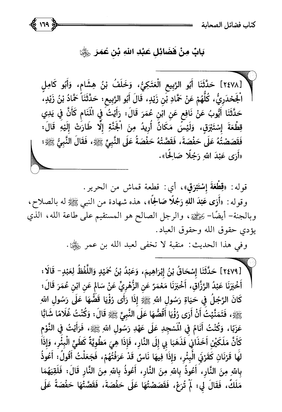 [٢٤٧٨] حَدَّثَنَا أَبُو الرَّبِيعِ الْعَتَكِيُّ، وَخَلَفُ بْنُ هِشَامٍ، وَأَبُو كَامِلٍ الْجَحْدَرِيُّ، كُلُّهُمْ عَنْ حَمَّادِ بْنِ زَيْدٍ، قَالَ أَبُو الرَّبِيعِ: حَدَّثَنَا حَمَّادُ بْنُ زَيْدٍ، حَدَّثَنَا أَيُّوبُ عَنْ نَافِعٍ عَنِ ابْنِ عُمَرَ قَالَ: رَأَيْتُ فِي الْمَنَامِ كَأَنَّ فِي يَدِي قِطْعَةَ إِسْتَبْرَقٍ، وَلَيْسَ مَكَانٌ أُرِيدُ مِنَ الْجَنَّةِ إِلَّا طَارَتْ إِلَيْهِ قَالَ: فَقَصَصْتُهُ عَلَى حَفْصَةَ، فَقَصَّتْهُ حَفْصَةُ عَلَى النَّبِيِّ صلى الله عليه وسلم، فَقَالَ النَّبِيُّ صلى الله عليه وسلم: ((أَرَى عَبْدَ للَّهِ رَجُلًا صَالِحًا)).