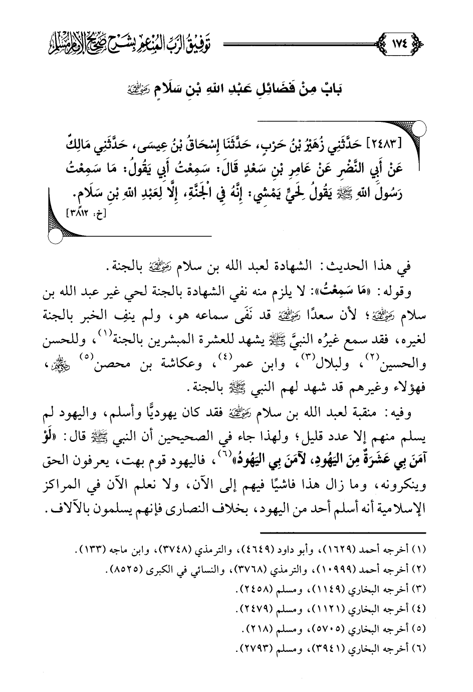 [٢٤٨٣] حَدَّثَنِي زُهَيْرُ بْنُ حَرْبٍ، حَدَّثَنَا إِسْحَاقُ بْنُ عِيسَى، حَدَّثَنِي مَالِكٌ عَنْ أَبِي النَّضْرِ عَنْ عَامِرِ بْنِ سَعْدٍ قَالَ: سَمِعْتُ أَبِي يَقُولُ: مَا سَمِعْتُ رَسُولَ اللَّهِ صلى الله عليه وسلم يَقُولُ لِحَيٍّ يَمْشِي: إِنَّهُ فِي الْجَنَّةِ، إِلَّا لِعَبْدِ اللَّهِ بْنِ سَلَامٍ.