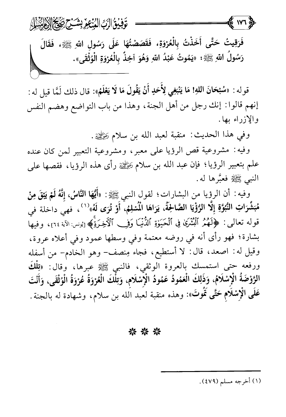 وفيه: أن الرؤيا من البشارات؛ لقول النبي صلى الله عليه وسلم: ((أَيُّهَا النَّاسُ، إِنَّهُ لَمْ يَبْقَ مِنْ مُبَشِّرَاتِ النُّبُوَّةِ إِلَّا الرُّؤْيَا الصَّالِحَةُ، يَرَاهَا الْمُسْلِمُ، أَوْ تُرَى لَهُ)) (¬١)، فهي داخلة في قوله تعالى: {لَهُمُ الْبُشْرَى فِي الْحَيَاةِ الدُّنْيَا وفي الآخرة}، وفيها بشارة؛ فهو رأى أنه في روضه معتمة وفي وسطها عمود وفي أعلاه عروة، وقيل له: اصعد، قال: لا أستطيع، فجاء مِنصف- وهو الخادم- من أسفله ورفعه حتى استمسك بالعروة الوثقي، فالنبي صلى الله عليه وسلم عبرها، وقال: ((تِلْكَ الرَّوْضَةُ الْإِسْلَامُ، وَذَلِكَ الْعَمُودُ عَمُودُ الْإِسْلَامِ، وَتِلْكَ الْعُرْوَةُ عُرْوَةُ الْوُثْقَى، وَأَنْتَ عَلَى الْإِسْلَامِ حَتَّى تَمُوتَ)): وهذه منقبة لعبد الله بن سلام، وشهادة له بالجنة.