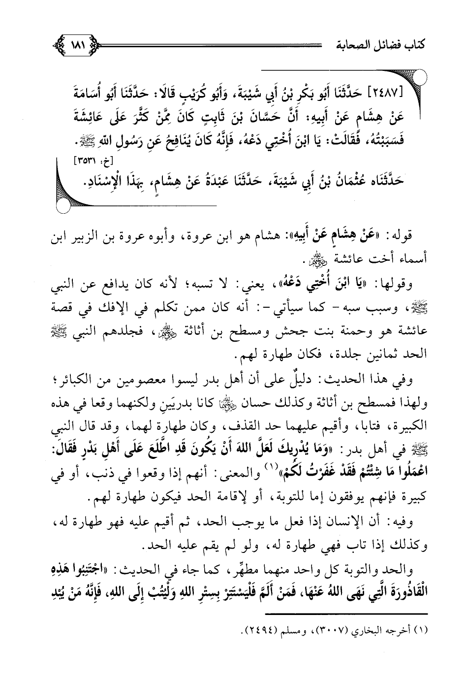 [٢٤٨٧] حَدَّثَنَا أَبُو بَكْرِ بْنُ أَبِي شَيْبَةَ، وَأَبُو كُرَيْبٍ قَالَا: حَدَّثَنَا أَبُو أُسَامَةَ عَنْ هِشَامٍ عَنْ أَبِيهِ: أَنَّ حَسَّانَ بْنَ ثَابِتٍ كَانَ مِمَّنْ كَثَّرَ عَلَى عَائِشَةَ فَسَبَبْتُهُ، فَقَالَتْ: يَا ابْنَ أُخْتِي دَعْهُ، فَإِنَّهُ كَانَ يُنَافِحُ عَنِ رَسُولِ اللَّهِ صلى الله عليه وسلم.
