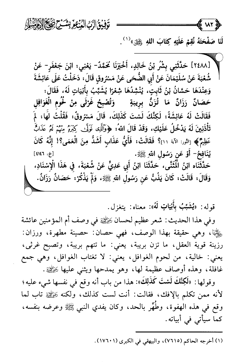 [٢٤٨٨] حَدَّثَنِي بِشْرُ بْنُ خَالِدٍ، أَخْبَرَنَا مُحَمَّدٌ- يَعْنِي: ابْنَ جَعْفَرٍ- عَنْ شُعْبَةَ عَنْ سُلَيْمَانَ عَنْ أَبِي الضُّحَى عَنْ مَسْرُوقٍ قَالَ: دَخَلْتُ عَلَى عَائِشَةَ وَعِنْدَهَا حَسَّانُ بْنُ ثَابِتٍ، يُنْشِدُهَا شِعْرًا يُشَبِّبُ بِأَبْيَاتٍ لَهُ، فَقَالَ: