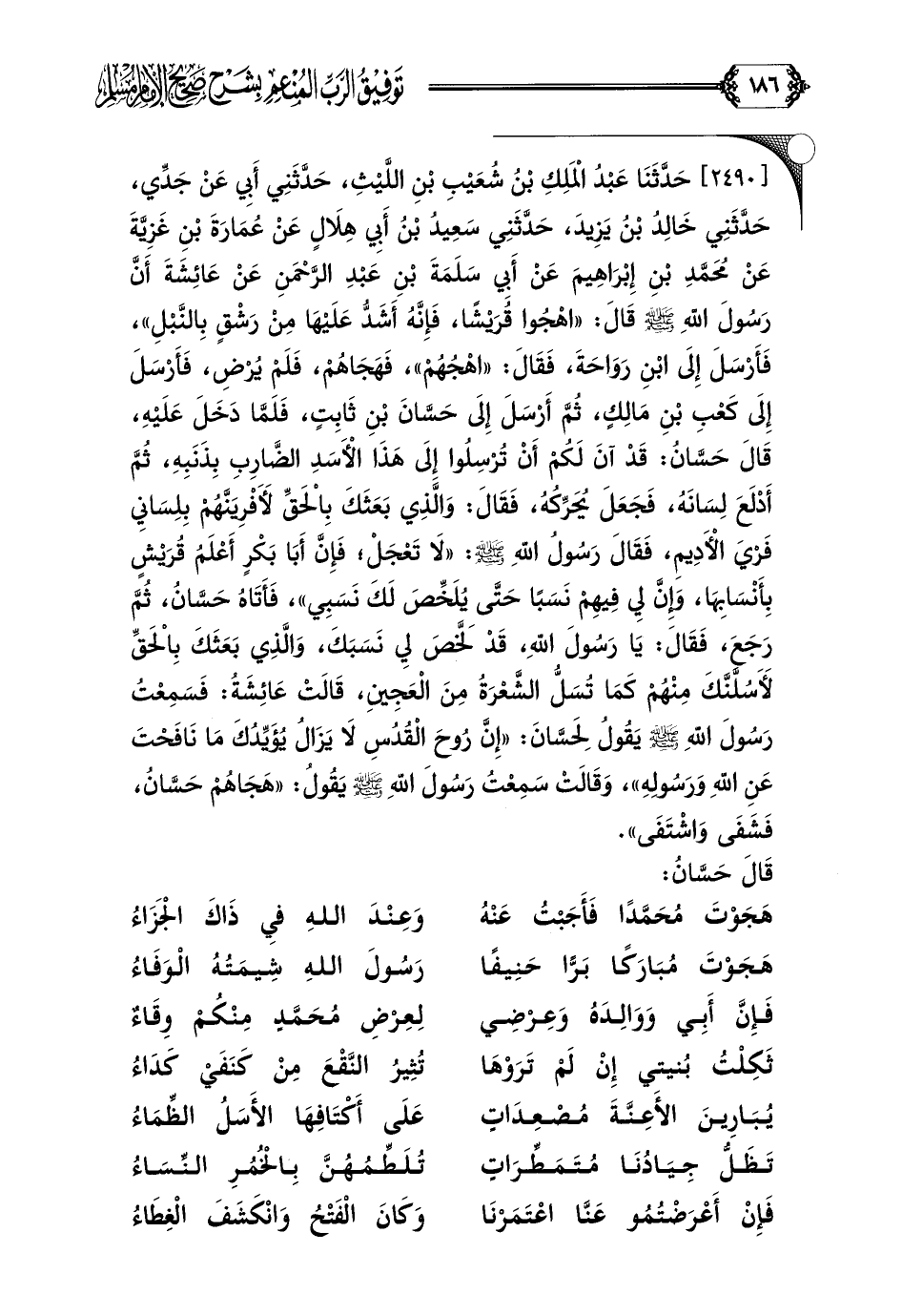 [٢٤٩٠] حَدَّثَنَا عَبْدُ الْمَلِكِ بْنُ شُعَيْبِ بْنِ اللَّيْثِ، حَدَّثَنِي أَبِي عَنْ جَدِّي، حَدَّثَنِي خَالِدُ بْنُ يَزِيدَ، حَدَّثَنِي سَعِيدُ بْنُ أَبِي هِلَالٍ عَنْ عُمَارَةَ بْنِ غَزِيَّةَ عَنْ مُحَمَّدِ بْنِ إِبْرَاهِيمَ عَنْ أَبِي سَلَمَةَ بْنِ عَبْدِ الرَّحْمَنِ عَنْ عَائِشَةَ أَنَّ رَسُولَ اللَّهِ صلى الله عليه وسلم قَالَ: ((اهْجُوا قُرَيْشًا، فَإِنَّهُ أَشَدُّ عَلَيْهَا مِنْ رَشْقٍ بِالنَّبْلِ))، فَأَرْسَلَ إِلَى ابْنِ رَوَاحَةَ، فَقَالَ: ((اهْجُهُمْ))، فَهَجَاهُمْ، فَلَمْ يُرْضِ، فَأَرْسَلَ إِلَى كَعْبِ بْنِ مَالِكٍ، ثُمَّ أَرْسَلَ إِلَى حَسَّانَ بْنِ ثَابِتٍ، فَلَمَّا دَخَلَ عَلَيْهِ، قَالَ حَسَّانُ: قَدْ آنَ لَكُمْ أَنْ تُرْسِلُوا إِلَى هَذَا الْأَسَدِ الضَّارِبِ بِذَنَبِهِ، ثُمَّ أَدْلَعَ لِسَانَهُ، فَجَعَلَ يُحَرِّكُهُ، فَقَالَ: وَالَّذِي بَعَثَكَ بِالْحَقِّ لَأَفْرِيَنَّهُمْ بِلِسَانِي فَرْيَ الْأَدِيمِ، فَقَالَ رَسُولُ اللَّهِ صلى الله عليه وسلم: ((لَا تَعْجَلْ؛ فَإِنَّ أَبَا بَكْرٍ أَعْلَمُ قُرَيْشٍ بِأَنْسَابِهَا، وَإِنَّ لِي فِيهِمْ نَسَبًا حَتَّى يُلَخِّصَ لَكَ نَسَبِي))، فَأَتَاهُ حَسَّانُ، ثُمَّ رَجَعَ، فَقَالَ: يَا رَسُولَ اللَّهِ، قَدْ لَخَّصَ لِي نَسَبَكَ، وَالَّذِي بَعَثَكَ بِالْحَقِّ لَأَسُلَّنَّكَ مِنْهُمْ كَمَا تُسَلُّ الشَّعْرَةُ مِنَ الْعَجِينِ، قَالَتْ عَائِشَةُ: فَسَمِعْتُ رَسُولَ اللَّهِ صلى الله عليه وسلم يَقُولُ لِحَسَّانَ: ((إِنَّ رُوحَ الْقُدُسِ لَا يَزَالُ يُؤَيِّدُكَ مَا نَافَحْتَ عَنِ اللَّهِ وَرَسُولِهِ))، وَقَالَتْ سَمِعْتُ رَسُولَ اللَّهِ صلى الله عليه وسلم يَقُولُ: ((هَجَاهُمْ حَسَّانُ، فَشَفَى وَاشْتَفَى)).