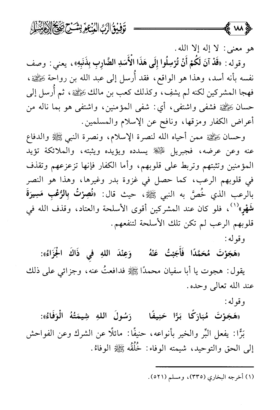 وقوله: ((هَجَوْتَ مُبَارَكًا بَرًّا حَنِيفًا ... رَسُولَ اللَّهِ شِيمَتُهُ الْوَفَاءُ)): بَرًّا: يفعل البِّر والخير بأنواعه، حنيفًا: مائلًا عن الشرك وعن الفواحش إلى الحق والتوحيد، شيمته الوفاء: خُلُقُه عليه الصلاة والسلام الوفاءُ.