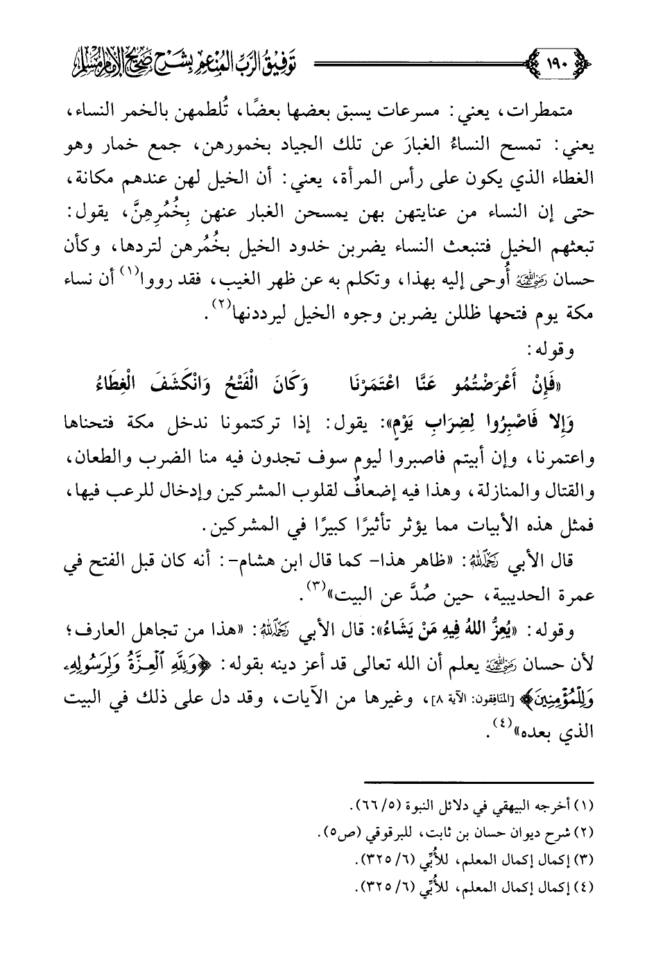 وقوله: ((يُعِزُّ اللَّهُ فِيهِ مَنْ يَشَاءُ)): قال الأبي رحمه الله: ((هذا من تجاهل العارف؛ لأن حسان رضي الله عنه يعلم أن الله تعالى قد أعز دينه بقوله: {ولله العزة ولرسوله وللمؤمنين}، وغيرها من الآيات، وقد دل على ذلك في البيت الذي بعده)) (¬٤).