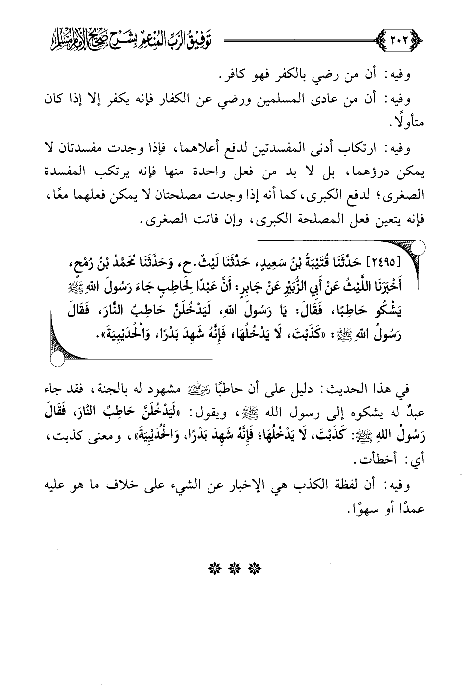 [٢٤٩٥] حَدَّثَنَا قُتَيْبَةُ بْنُ سَعِيدٍ، حَدَّثَنَا لَيْثٌ. ح، وَحَدَّثَنَا مُحَمَّدُ بْنُ رُمْحٍ، أَخْبَرَنَا اللَّيْثُ عَنْ أَبِي الزُّبَيْرِ عَنْ جَابِرٍ: أَنَّ عَبْدًا لِحَاطِبٍ جَاءَ رَسُولَ اللَّهِ صلى الله عليه وسلم يَشْكُو حَاطِبًا، فَقَالَ: يَا رَسُولَ اللَّهِ، لَيَدْخُلَنَّ حَاطِبٌ النَّارَ، فَقَالَ رَسُولُ اللَّهِ صلى الله عليه وسلم: ((كَذَبْتَ، لَا يَدْخُلُهَا؛ فَإِنَّهُ شَهِدَ بَدْرًا، وَالْحُدَيْبِيَةَ)).