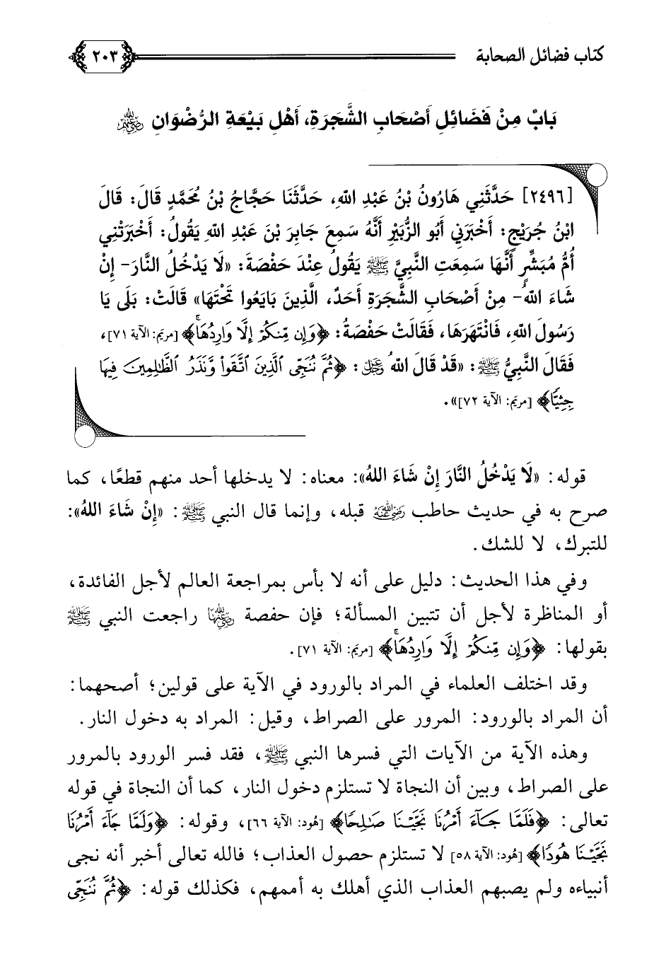 [٢٤٩٦] حَدَّثَنِي هَارُونُ بْنُ عَبْدِ اللَّهِ، حَدَّثَنَا حَجَّاجُ بْنُ مُحَمَّدٍ قَالَ: قَالَ ابْنُ جُرَيْجٍ: أَخْبَرَنِي أَبُو الزُّبَيْرِ أَنَّهُ سَمِعَ جَابِرَ بْنَ عَبْدِ اللَّهِ يَقُولُ: أَخْبَرَتْنِي أُمُّ مُبَشِّرٍ أَنَّهَا سَمِعَتِ النَّبِيَّ صلى الله عليه وسلم يَقُولُ عِنْدَ حَفْصَةَ: ((لَا يَدْخُلُ النَّارَ- إِنْ شَاءَ اللَّهُ- مِنْ أَصْحَابِ الشَّجَرَةِ أَحَدٌ، الَّذِينَ بَايَعُوا تَحْتَهَا)) قَالَتْ: بَلَى يَا رَسُولَ اللَّهِ، فَانْتَهَرَهَا، فَقَالَتْ حَفْصَةُ: {وَإِنْ مِنْكُمْ إِلا وَارِدُهَا}، فَقَالَ النَّبِيُّ صلى الله عليه وسلم: ((قَدْ قَالَ اللَّهُ عز وجل: {ثُمَّ نُنَجِّي الَّذِينَ اتَّقَوْا وَنَذَرُ الظَّالِمِينَ فِيهَا جِثِيًّا})).