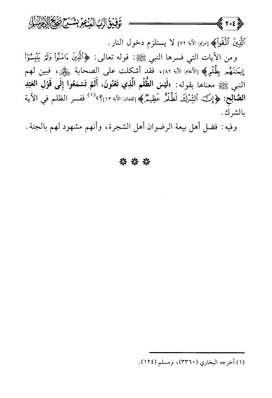 ومن الآيات التي فسرها النبي صلى الله عليه وسلم: قوله تعالى: {الذين آمنوا ولم يلبسوا إيمانهم بظلم}، فقد أشكلت على الصحابة رضي الله عنهم، فبين لهم النبي صلى الله عليه وسلم معناها بقوله: ((لَيْسَ الظُّلْم الَّذِي تَعْنُونَ، أَلَمْ تَسْمَعُوا إِلَى قَوْلِ العَبْدِ الصَّالِحِ: {إن الشرك لظلم عظيم}؟ )) (¬١) ففسر الظلم في الآية بالشرك.