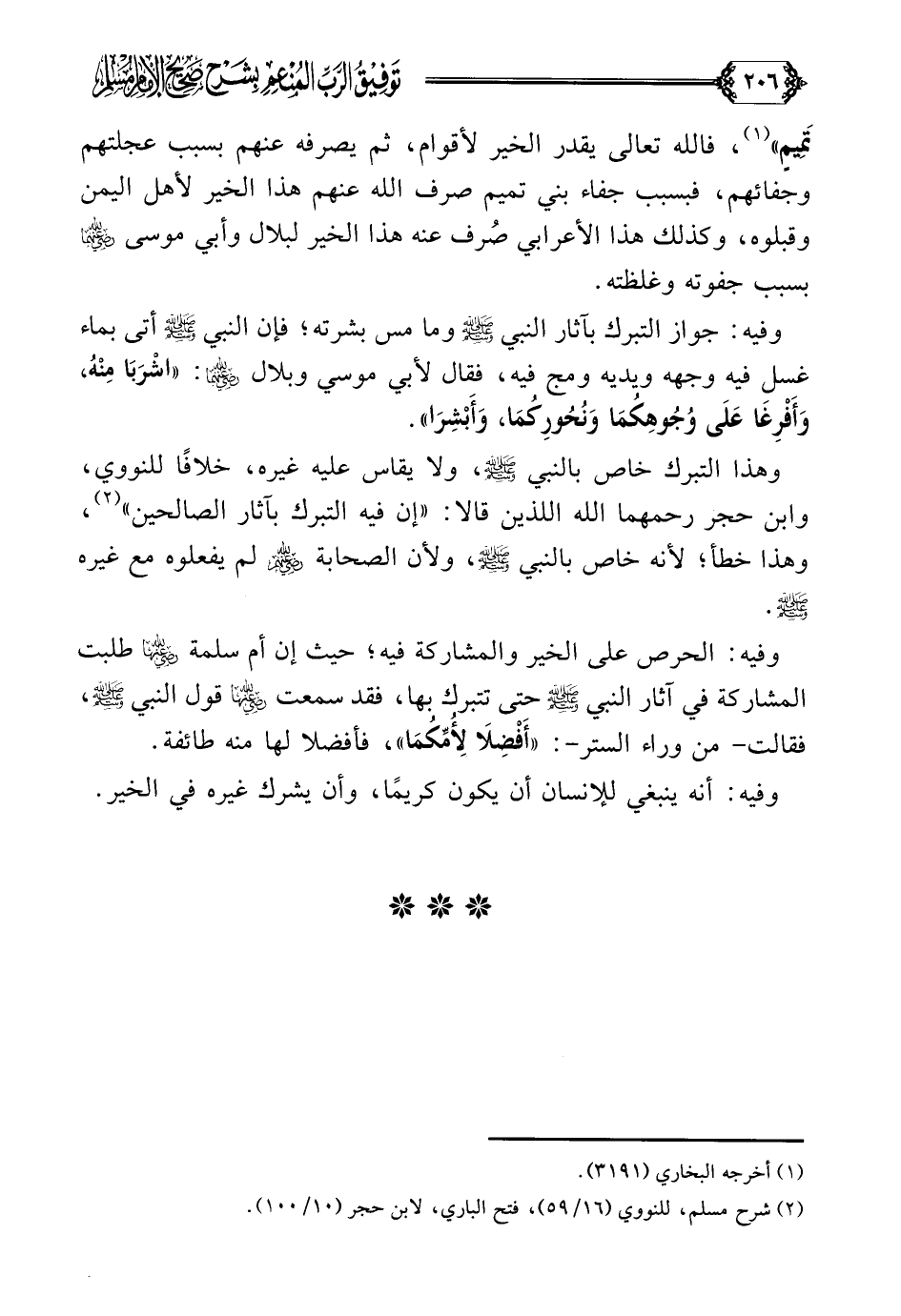 وهذا التبرك خاص بالنبي صلى الله عليه وسلم، ولا يقاس عليه غيره، خلافًا للنووي، وابن حجر رحمهما الله اللذين قالا: ((إن فيه التبرك بآثار الصالحين)) (¬٢)، وهذا خطأ؛ لأنه خاص بالنبي صلى الله عليه وسلم، ولأن الصحابة رضي الله عنهم لم يفعلوه مع غيره صلى الله عليه وسلم.