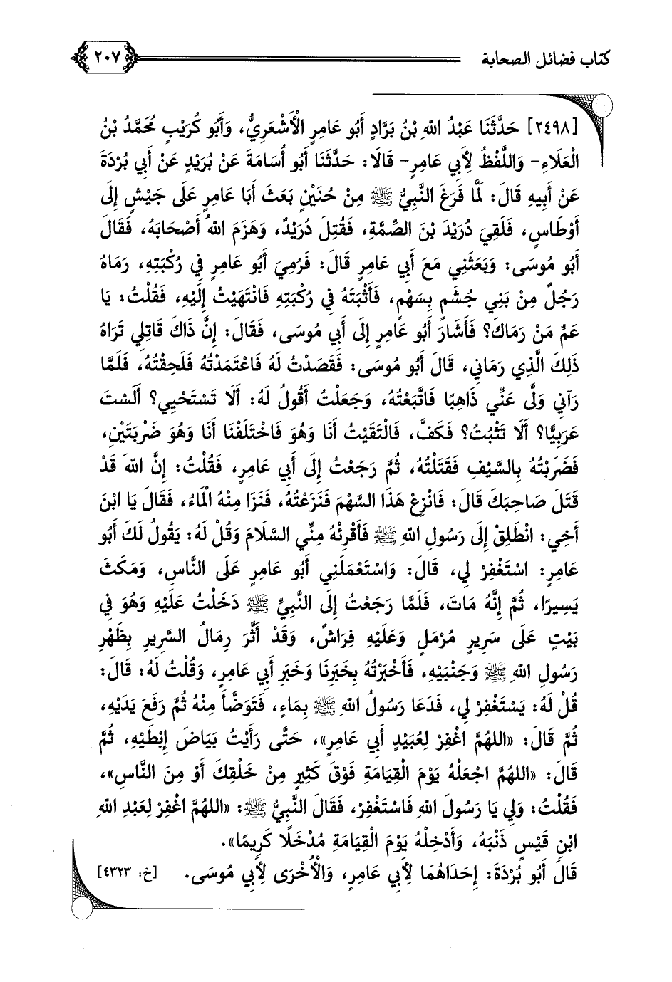 [٢٤٩٨] حَدَّثَنَا عَبْدُ اللَّهِ بْنُ بَرَّادٍ أَبُو عَامِرٍ الْأَشْعَرِيُّ، وَأَبُو كُرَيْبٍ مُحَمَّدُ بْنُ الْعَلَاءِ- وَاللَّفْظُ لِأَبِي عَامِرٍ- قَالَا: حَدَّثَنَا أَبُو أُسَامَةَ عَنْ بُرَيْدٍ عَنْ أَبِي بُرْدَةَ عَنْ أَبِيهِ قَالَ: لَمَّا فَرَغَ النَّبِيُّ صلى الله عليه وسلم مِنْ حُنَيْنٍ بَعَثَ أَبَا عَامِرٍ عَلَى جَيْشٍ إِلَى أَوْطَاسٍ، فَلَقِيَ دُرَيْدَ بْنَ الصِّمَّةِ، فَقُتِلَ دُرَيْدٌ، وَهَزَمَ اللَّهُ أَصْحَابَهُ، فَقَالَ أَبُو مُوسَى: وَبَعَثَنِي مَعَ أَبِي عَامِرٍ قَالَ: فَرُمِيَ أَبُو عَامِرٍ فِي رُكْبَتِهِ، رَمَاهُ رَجُلٌ مِنْ بَنِي جُشَمٍ بِسَهْمٍ، فَأَثْبَتَهُ فِي رُكْبَتِهِ فَانْتَهَيْتُ إِلَيْهِ، فَقُلْتُ: يَا عَمِّ مَنْ رَمَاكَ؟ فَأَشَارَ أَبُو عَامِرٍ إِلَى أَبِي مُوسَى، فَقَالَ: إِنَّ ذَاكَ قَاتِلِي تَرَاهُ ذَلِكَ الَّذِي رَمَانِي، قَالَ أَبُو مُوسَى: فَقَصَدْتُ لَهُ فَاعْتَمَدْتُهُ فَلَحِقْتُهُ، فَلَمَّا رَآنِي وَلَّى عَنِّي ذَاهِبًا فَاتَّبَعْتُهُ، وَجَعَلْتُ أَقُولُ لَهُ: أَلَا تَسْتَحْيِي؟ أَلَسْتَ عَرَبِيًّا؟ أَلَا تَثْبُتُ؟ فَكَفَّ، فَالْتَقَيْتُ أَنَا وَهُوَ فَاخْتَلَفْنَا أَنَا وَهُوَ ضَرْبَتَيْنِ، فَضَرَبْتُهُ بِالسَّيْفِ فَقَتَلْتُهُ، ثُمَّ رَجَعْتُ إِلَى أَبِي عَامِرٍ، فَقُلْتُ: إِنَّ اللَّهَ قَدْ قَتَلَ صَاحِبَكَ قَالَ: فَانْزِعْ هَذَا السَّهْمَ فَنَزَعْتُهُ، فَنَزَا مِنْهُ الْمَاءُ، فَقَالَ يَا ابْنَ أَخِي: انْطَلِقْ إِلَى رَسُولِ اللَّهِ صلى الله عليه وسلم فَأَقْرِئْهُ مِنِّي السَّلَامَ وَقُلْ لَهُ: يَقُولُ لَكَ أَبُو عَامِرٍ: اسْتَغْفِرْ لِي، قَالَ: وَاسْتَعْمَلَنِي أَبُو عَامِرٍ عَلَى النَّاسِ، وَمَكَثَ يَسِيرًا، ثُمَّ إِنَّهُ مَاتَ، فَلَمَّا رَجَعْتُ إِلَى النَّبِيِّ صلى الله عليه وسلم دَخَلْتُ عَلَيْهِ وَهُوَ فِي بَيْتٍ عَلَى