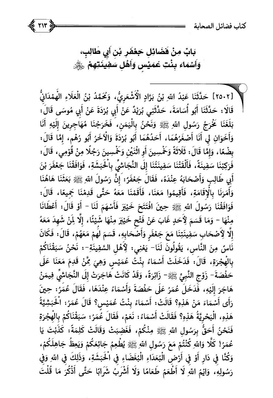[٢٥٠٢] حَدَّثَنَا عَبْدُ اللَّهِ بْنُ بَرَّادٍ الْأَشْعَرِيُّ، وَمُحَمَّدُ بْنُ الْعَلَاءِ الْهَمْدَانِيُّ قَالَا: حَدَّثَنَا أَبُو أُسَامَةَ، حَدَّثَنِي بُرَيْدٌ عَنْ أَبِي بُرْدَةَ عَنْ أَبِي مُوسَى قَالَ: بَلَغَنَا مَخْرَجُ رَسُولِ اللَّهِ صلى الله عليه وسلم وَنَحْنُ بِالْيَمَنِ، فَخَرَجْنَا مُهَاجِرِينَ إِلَيْهِ أَنَا وَأَخَوَانِ لِي أَنَا أَصْغَرُهُمَا، أَحَدُهُمَا أَبُو بُرْدَةَ وَالْآخَرُ أَبُو رُهْمٍ، إِمَّا قَالَ: بِضْعًا، وَإِمَّا قَالَ: ثَلَاثَةً وَخَمْسِينَ أَوِ اثْنَيْنِ وَخَمْسِينَ رَجُلًا مِنْ قَوْمِي قَالَ: فَرَكِبْنَا سَفِينَةً، فَأَلْقَتْنَا سَفِينَتُنَا إِلَى النَّجَاشِيِّ بِالْحَبَشَةِ، فَوَافَقْنَا جَعْفَرَ بْنَ أَبِي طَالِبٍ وَأَصْحَابَهُ عِنْدَهُ، فَقَالَ جَعْفَرٌ: إِنَّ رَسُولَ اللَّهِ صلى الله عليه وسلم بَعَثَنَا هَاهُنَا وَأَمَرَنَا بِالْإِقَامَةِ، فَأَقِيمُوا مَعَنَا، فَأَقَمْنَا مَعَهُ حَتَّى قَدِمْنَا جَمِيعًا قَالَ: فَوَافَقْنَا رَسُولَ اللَّهِ صلى الله عليه وسلم حِينَ افْتَتَحَ خَيْبَرَ فَأَسْهَمَ لَنَا أَوْ قَالَ: أَعْطَانَا مِنْهَا وَمَا قَسَمَ لِأَحَدٍ غَابَ عَنْ فَتْحِ خَيْبَرَ مِنْهَا شَيْئًا، إِلَّا لِمَنْ شَهِدَ مَعَهُ إِلَّا لِأَصْحَابِ سَفِينَتِنَا مَعَ جَعْفَرٍ وَأَصْحَابِهِ، قَسَمَ لَهُمْ مَعَهُمْ قَالَ: فَكَانَ نَاسٌ مِنَ النَّاسِ، يَقُولُونَ لَنَا- يَعْنِي: لِأَهْلِ السَّفِينَةِ-: نَحْنُ سَبَقْنَاكُمْ بِالْهِجْرَةِ قَالَ: فَدَخَلَتْ أَسْمَاءُ بِنْتُ عُمَيْسٍ وَهِيَ مِمَّنْ قَدِمَ مَعَنَا عَلَى حَفْصَةَ- زَوْجِ النَّبِيِّ صلى الله عليه وسلم- زَائِرَةً، وَقَدْ كَانَتْ هَاجَرَتْ إِلَى النَّجَاشِيِّ فِيمَنْ هَاجَرَ إِلَيْهِ، فَدَخَلَ عُمَرُ عَلَى حَفْصَةَ وَأَسْمَاءُ عِنْدَهَا، فَقَالَ عُمَرُ: حِينَ رَأَى أَسْمَاءَ مَنْ هَذِهِ؟