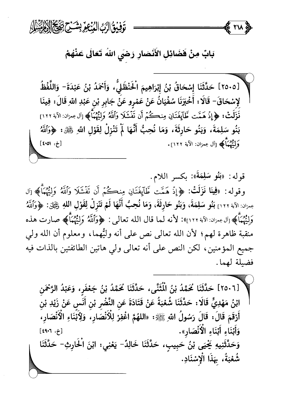 [٢٥٠٥] حَدَّثَنَا إِسْحَاقُ بْنُ إِبْرَاهِيمَ الْحَنْظَلِيُّ، وَأَحْمَدُ بْنُ عَبْدَةَ- وَاللَّفْظُ لِإِسْحَاقَ- قَالَا: أَخْبَرَنَا سُفْيَانُ عَنْ عَمْرٍو عَنْ جَابِرِ بْنِ عَبْدِ اللَّهِ قَالَ: فِينَا نَزَلَتْ: {إِذْ هَمَّتْ طَائِفَتَانِ مِنْكُمْ أَنْ تَفْشَلا وَاللَّهُ وَلِيُّهُمَا} بَنُو سَلِمَةَ، وَبَنُو حَارِثَةَ، وَمَا نُحِبُّ أَنَّهَا لَمْ تَنْزِلْ لِقَوْلِ اللَّهِ عز وجل: {وَاللَّهُ وَلِيُّهُمَا}.