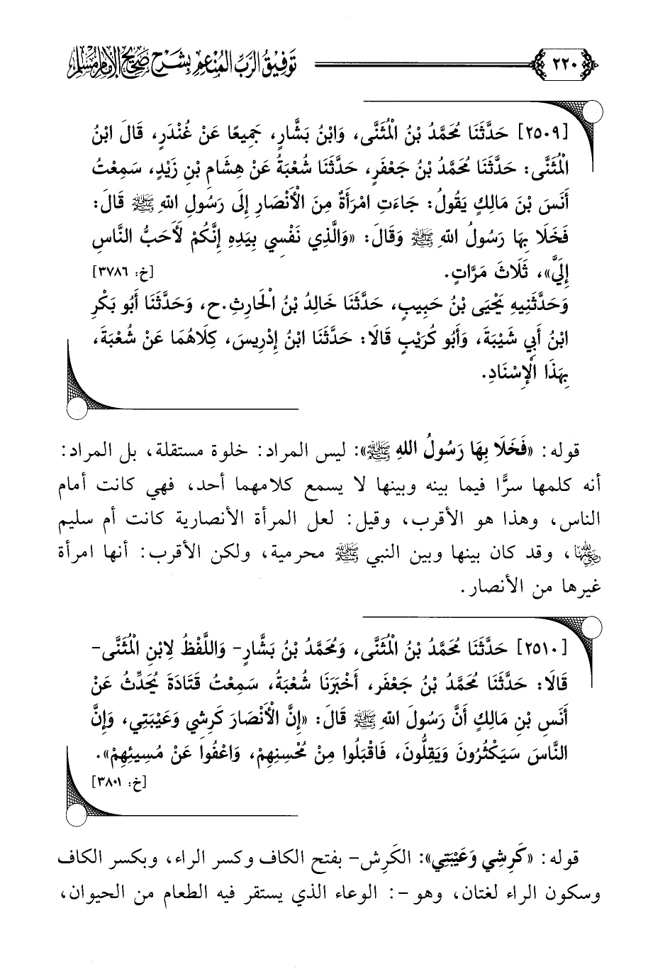[٢٥٠٩] حَدَّثَنَا مُحَمَّدُ بْنُ الْمُثَنَّى، وَابْنُ بَشَّارٍ، جَمِيعًا عَنْ غُنْدَرٍ، قَالَ ابْنُ الْمُثَنَّى: حَدَّثَنَا مُحَمَّدُ بْنُ جَعْفَرٍ، حَدَّثَنَا شُعْبَةُ عَنْ هِشَامِ بْنِ زَيْدٍ، سَمِعْتُ أَنَسَ بْنَ مَالِكٍ يَقُولُ: جَاءَتِ امْرَأَةٌ مِنْ الْأَنْصَارِ إِلَى رَسُولِ اللَّهِ صلى الله عليه وسلم قَالَ: فَخَلَا بِهَا رَسُولُ اللَّهِ صلى الله عليه وسلم وَقَالَ: ((وَالَّذِي نَفْسِي بِيَدِهِ إِنَّكُمْ لَأَحَبُّ النَّاسِ إِلَيَّ))، ثَلَاثَ مَرَّاتٍ.