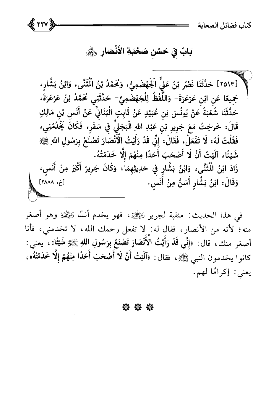 [٢٥١٣] حَدَّثَنَا نَصْرُ بْنُ عَلِيٍّ الْجَهْضَمِيُّ، وَمُحَمَّدُ بْنُ الْمُثَنَّى، وَابْنُ بَشَّارٍ، جَمِيعًا عَنِ ابْنِ عَرْعَرَةَ- وَاللَّفْظُ لِلْجَهْضَمِيِّ- حَدَّثَنِي مُحَمَّدُ بْنُ عَرْعَرَةَ، حَدَّثَنَا شُعْبَةُ عَنْ يُونُسَ بْنِ عُبَيْدٍ عَنْ ثَابِتٍ الْبُنَانِيِّ عَنْ أَنَسِ بْنِ مَالِكٍ قَالَ: خَرَجْتُ مَعَ جَرِيرِ بْنِ عَبْدِ اللَّهِ الْبَجَلِيِّ فِي سَفَرٍ، فَكَانَ يَخْدُمُنِي، فَقُلْتُ لَهُ: لَا تَفْعَلْ، فَقَالَ: إِنِّي قَدْ رَأَيْتُ الْأَنْصَارَ تَصْنَعُ بِرَسُولِ اللَّهِ صلى الله عليه وسلم شَيْئًا، آلَيْتُ أَنْ لَا أَصْحَبَ أَحَدًا مِنْهُمْ إِلَّا خَدَمْتُهُ.
