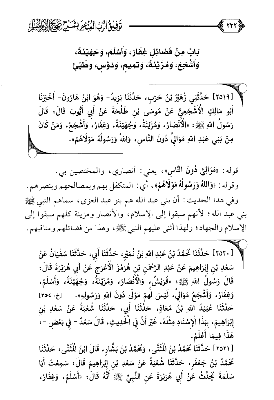 [٢٥١٩] حَدَّثَنِي زُهَيْرُ بْنُ حَرْبٍ، حَدَّثَنَا يَزِيدُ- وَهُوَ ابْنُ هَارُونَ- أَخْبَرَنَا أَبُو مَالِكٍ الْأَشْجَعِيُّ عَنْ مُوسَى بْنِ طَلْحَةَ عَنْ أَبِي أَيُّوبَ قَالَ: قَالَ رَسُولُ اللَّهِ صلى الله عليه وسلم: ((الْأَنْصَارُ، وَمُزَيْنَةُ، وَجُهَيْنَةُ، وَغِفَارُ، وَأَشْجَعُ، وَمَنْ كَانَ مِنْ بَنِي عَبْدِ اللَّهِ مَوَالِيَّ دُونَ النَّاسِ، وَاللَّهُ وَرَسُولُهُ مَوْلَاهُمْ)).