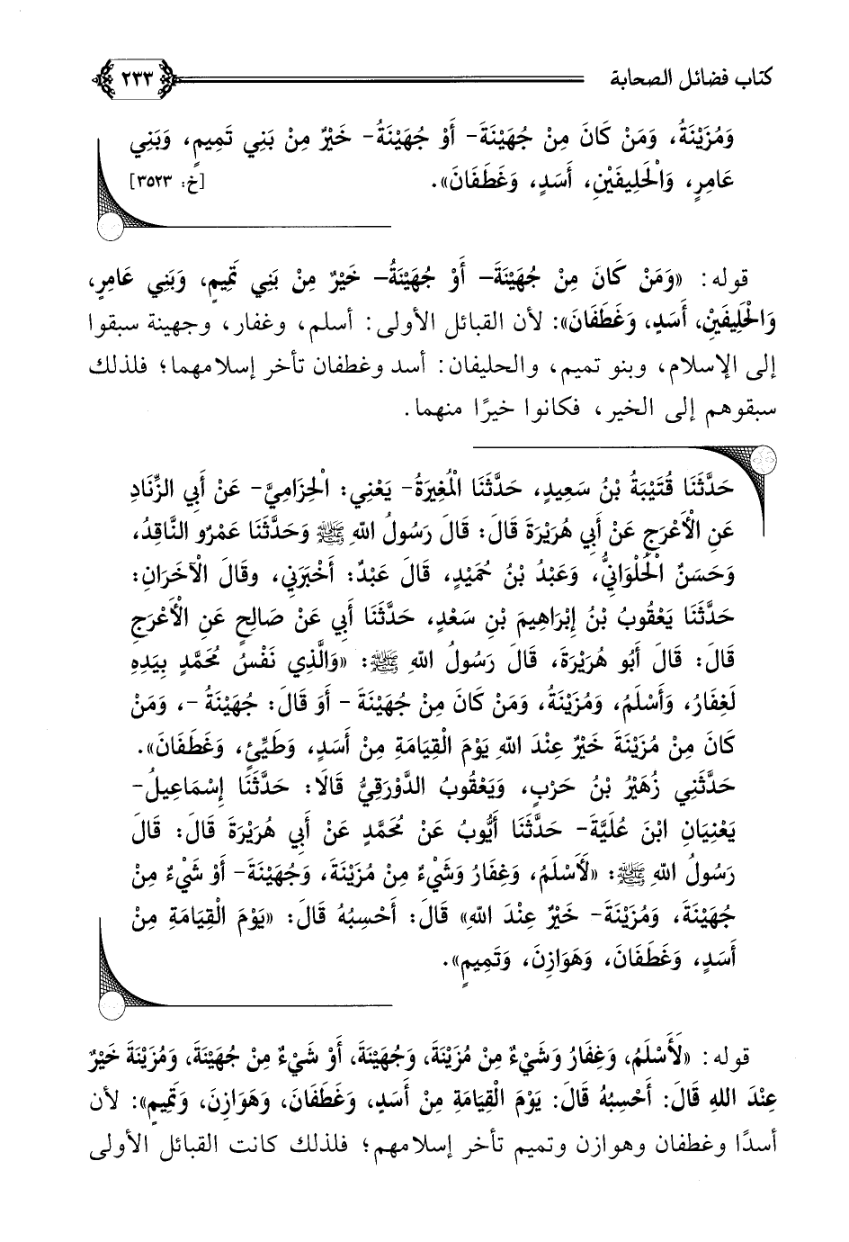 حَدَّثَنَا قُتَيْبَةُ بْنُ سَعِيدٍ، حَدَّثَنَا الْمُغِيرَةُ- يَعْنِي: الْحِزَامِيَّ- عَنْ أَبِي الزِّنَادِ عَنِ الْأَعْرَجِ عَنْ أَبِي هُرَيْرَةَ قَالَ: قَالَ رَسُولُ اللَّهِ صلى الله عليه وسلم وَحَدَّثَنَا عَمْرٌو النَّاقِدُ، وَحَسَنٌ الْحُلْوَانِيُّ، وَعَبْدُ بْنُ حُمَيْدٍ، قَالَ عَبْدٌ: أَخْبَرَنِي، وقَالَ الْآخَرَانِ: حَدَّثَنَا يَعْقُوبُ بْنُ إِبْرَاهِيمَ بْنِ سَعْدٍ، حَدَّثَنَا أَبِي عَنْ صَالِحٍ عَنِ الْأَعْرَجِ قَالَ: قَالَ أَبُو هُرَيْرَةَ، قَالَ رَسُولُ اللَّهِ صلى الله عليه وسلم: ((وَالَّذِي نَفْسُ مُحَمَّدٍ بِيَدِهِ لَغِفَارُ، وَأَسْلَمُ، وَمُزَيْنَةُ، وَمَنْ كَانَ مِنْ جُهَيْنَةَ أَوَ قَالَ: جُهَيْنَةُ، وَمَنْ كَانَ مِنْ مُزَيْنَةَ خَيْرٌ عِنْدَ اللَّهِ يَوْمَ الْقِيَامَةِ مِنْ أَسَدٍ، وَطَيِّئٍ، وَغَطَفَانَ)).