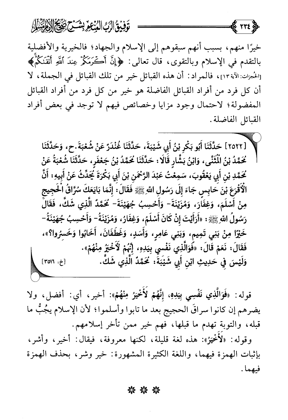 [٢٥٢٢] حَدَّثَنَا أَبُو بَكْرِ بْنُ أَبِي شَيْبَةَ، حَدَّثَنَا غُنْدَرٌ عَنْ شُعْبَةَ. ح، وَحَدَّثَنَا مُحَمَّدُ بْنُ الْمُثَنَّى، وَابْنُ بَشَّارٍ قَالَا: حَدَّثَنَا مُحَمَّدُ بْنُ جَعْفَرٍ، حَدَّثَنَا شُعْبَةُ عَنْ مُحَمَّدِ بْنِ أَبِي يَعْقُوبَ، سَمِعْتُ عَبْدَ الرَّحْمَنِ بْنَ أَبِي بَكْرَةَ يُحَدِّثُ عَنْ أَبِيهِ: أَنَّ الْأَقْرَعَ بْنَ حَابِسٍ جَاءَ إِلَى رَسُولِ اللَّهِ صلى الله عليه وسلم فَقَالَ: إِنَّمَا بَايَعَكَ سُرَّاقُ الْحَجِيجِ مِنْ أَسْلَمَ، وَغِفَارَ، وَمُزَيْنَةَ- وَأَحْسِبُ جُهَيْنَةَ- مُحَمَّدٌ الَّذِي شَكَّ، فَقَالَ رَسُولُ اللَّهِ صلى الله عليه وسلم: ((أَرَأَيْتَ إِنْ كَانَ أَسْلَمُ، وَغِفَارُ، وَمُزَيْنَةُ- وَأَحْسِبُ جُهَيْنَةُ- خَيْرًا مِنْ بَنِي تَمِيمٍ، وَبَنِي عَامِرٍ، وَأَسَدٍ، وَغَطَفَانَ، أَخَابُوا وَخَسِرُوا؟ ))، فَقَالَ: نَعَمْ قَالَ: ((فَوَالَّذِي نَفْسِي بِيَدِهِ، إِنَّهُمْ لَأَخْيَرُ مِنْهُمْ)).