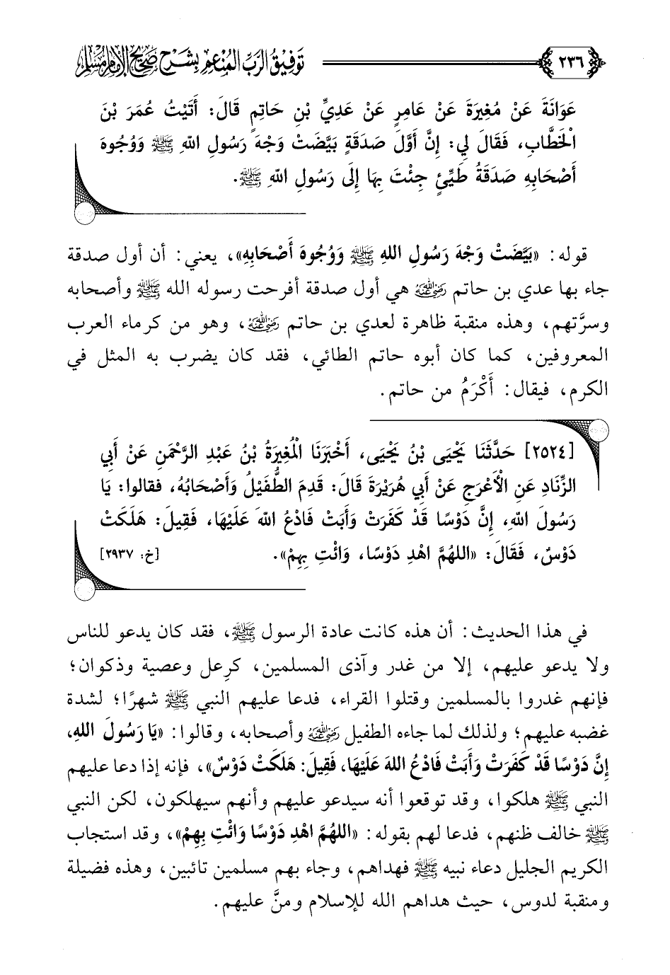 عَوَانَةَ عَنْ مُغِيرَةَ عَنْ عَامِرٍ عَنْ عَدِيِّ بْنِ حَاتِمٍ قَالَ: أَتَيْتُ عُمَرَ بْنَ الْخَطَّابِ، فَقَالَ لِي: إِنَّ أَوَّلَ صَدَقَةٍ بَيَّضَتْ وَجْهَ رَسُولِ اللَّهِ صلى الله عليه وسلم وَوُجُوهَ أَصْحَابِهِ صَدَقَةُ طَيِّئٍ جِئْتَ بِهَا إِلَى رَسُولِ اللَّهِ صلى الله عليه وسلم.