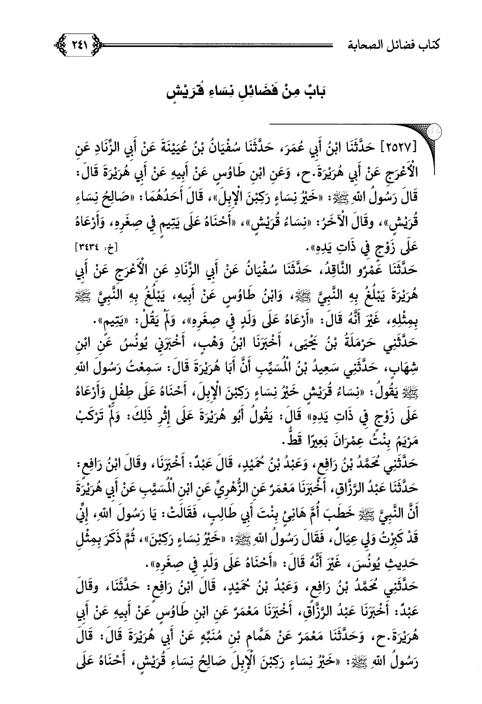 [٢٥٢٧] حَدَّثَنَا ابْنُ أَبِي عُمَرَ، حَدَّثَنَا سُفْيَانُ بْنُ عُيَيْنَةَ عَنْ أَبِي الزِّنَادِ عَنِ الْأَعْرَجِ عَنْ أَبِي هُرَيْرَةَ. ح، وَعَنِ ابْنِ طَاوُسٍ عَنْ أَبِيهِ عَنْ أَبِي هُرَيْرَةَ قَالَ: قَالَ رَسُولُ اللَّهِ صلى الله عليه وسلم: ((خَيْرُ نِسَاءٍ رَكِبْنَ الْإِبِلَ))، قَالَ أَحَدُهُمَا: ((صَالِحُ نِسَاءِ قُرَيْشٍ))، وقَالَ الْآخَرُ: ((نِسَاءُ قُرَيْشٍ))، ((أَحْنَاهُ عَلَى يَتِيمٍ فِي صِغَرِهِ، وَأَرْعَاهُ عَلَى زَوْجٍ فِي ذَاتِ يَدِهِ)).