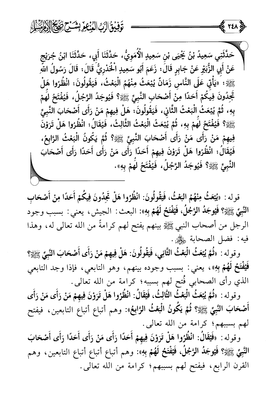 حَدَّثَنِي سَعِيدُ بْنُ يَحْيَى بْنِ سَعِيدٍ الْأُمَوِيُّ، حَدَّثَنَا أَبِي، حَدَّثَنَا ابْنُ جُرَيْجٍ عَنْ أَبِي الزُّبَيْرِ عَنْ جَابِرٍ قَالَ: زَعَمَ أَبُو سَعِيدٍ الْخُدْرِيُّ قَالَ: قَالَ رَسُولُ اللَّهِ صلى الله عليه وسلم: ((يَأْتِي عَلَى النَّاسِ زَمَانٌ يُبْعَثُ مِنْهُمُ الْبَعْثُ، فَيَقُولُونَ: انْظُرُوا هَلْ تَجِدُونَ فِيكُمْ أَحَدًا مِنْ أَصْحَابِ النَّبِيِّ صلى الله عليه وسلم؟ فَيُوجَدُ الرَّجُلُ، فَيُفْتَحُ لَهُمْ بِهِ، ثُمَّ يُبْعَثُ الْبَعْثُ الثَّانِي، فَيَقُولُونَ: هَلْ فِيهِمْ مَنْ رَأَى أَصْحَابَ النَّبِيِّ صلى الله عليه وسلم؟ فَيُفْتَحُ لَهُمْ بِهِ، ثُمَّ يُبْعَثُ الْبَعْثُ الثَّالِثُ، فَيُقَالُ: انْظُرُوا هَلْ تَرَوْنَ فِيهِمْ مَنْ رَأَى مَنْ رَأَى أَصْحَابَ النَّبِيِّ صلى الله عليه وسلم؟ ثُمَّ يَكُونُ الْبَعْثُ الرَّابِعُ، فَيُقَالُ: انْظُرُوا هَلْ تَرَوْنَ فِيهِمْ أَحَدًا رَأَى مَنْ رَأَى أَحَدًا رَأَى أَصْحَابَ النَّبِيِّ صلى الله عليه وسلم؟ فَيُوجَدُ الرَّجُلُ، فَيُفْتَحُ لَهُمْ بِهِ)).