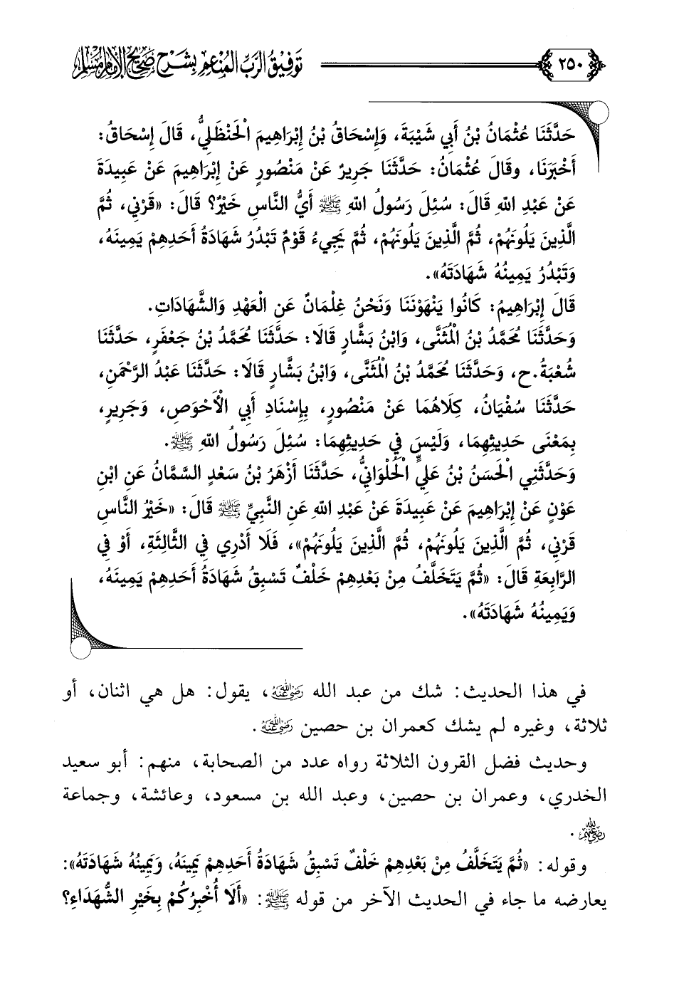حَدَّثَنَا عُثْمَانُ بْنُ أَبِي شَيْبَةَ، وَإِسْحَاقُ بْنُ إِبْرَاهِيمَ الْحَنْظَلِيُّ، قَالَ إِسْحَاقُ: أَخْبَرَنَا، وقَالَ عُثْمَانُ: حَدَّثَنَا جَرِيرٌ عَنْ مَنْصُورٍ عَنْ إِبْرَاهِيمَ عَنْ عَبِيدَةَ عَنْ عَبْدِ اللَّهِ قَالَ: سُئِلَ رَسُولُ اللَّهِ صلى الله عليه وسلم أَيُّ النَّاسِ خَيْرٌ؟ قَالَ: ((قَرْنِي، ثُمَّ الَّذِينَ يَلُونَهُمْ، ثُمَّ الَّذِينَ يَلُونَهُمْ، ثُمَّ يَجِيءُ قَوْمٌ تَبْدُرُ شَهَادَةُ أَحَدِهِمْ يَمِينَهُ، وَتَبْدُرُ يَمِينُهُ شَهَادَتَهُ)).