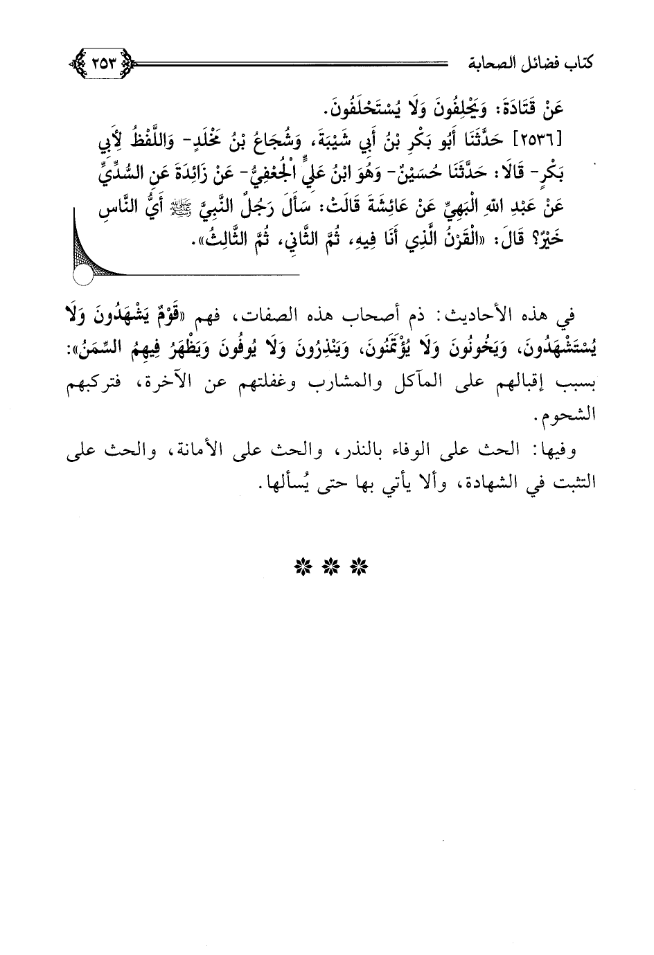 [٢٥٣٦] حَدَّثَنَا أَبُو بَكْرِ بْنُ أَبِي شَيْبَةَ، وَشُجَاعُ بْنُ مَخْلَدٍ- وَاللَّفْظُ لِأَبِي بَكْرٍ- قَالَا: حَدَّثَنَا حُسَيْنٌ- وَهُوَ ابْنُ عَلِيٍّ الْجُعْفِيُّ- عَنْ زَائِدَةَ عَنِ السُّدِّيِّ عَنْ عَبْدِ اللَّهِ الْبَهِيِّ عَنْ عَائِشَةَ قَالَتْ: سَأَلَ رَجُلٌ النَّبِيَّ صلى الله عليه وسلم أَيُّ النَّاسِ خَيْرٌ؟ قَالَ: ((الْقَرْنُ الَّذِي أَنَا فِيهِ، ثُمَّ الثَّانِي، ثُمَّ الثَّالِثُ)).