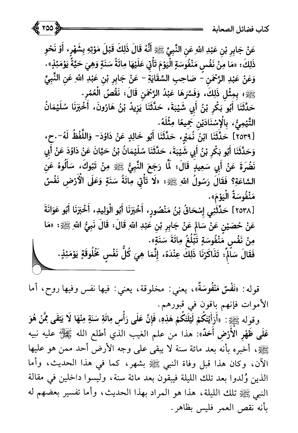 [٢٥٣٨] حَدَّثَنِي إِسْحَاقُ بْنُ مَنْصُورٍ، أَخْبَرَنَا أَبُو الْوَلِيدِ، أَخْبَرَنَا أَبُو عَوَانَةَ عَنْ حُصَيْنٍ عَنْ سَالِمٍ عَنْ جَابِرِ بْنِ عَبْدِ اللَّهِ قَالَ: قَالَ نَبِيُّ اللَّهِ صلى الله عليه وسلم: ((مَا مِنْ نَفْسٍ مَنْفُوسَةٍ تَبْلُغُ مِائَةَ سَنَةٍ)).