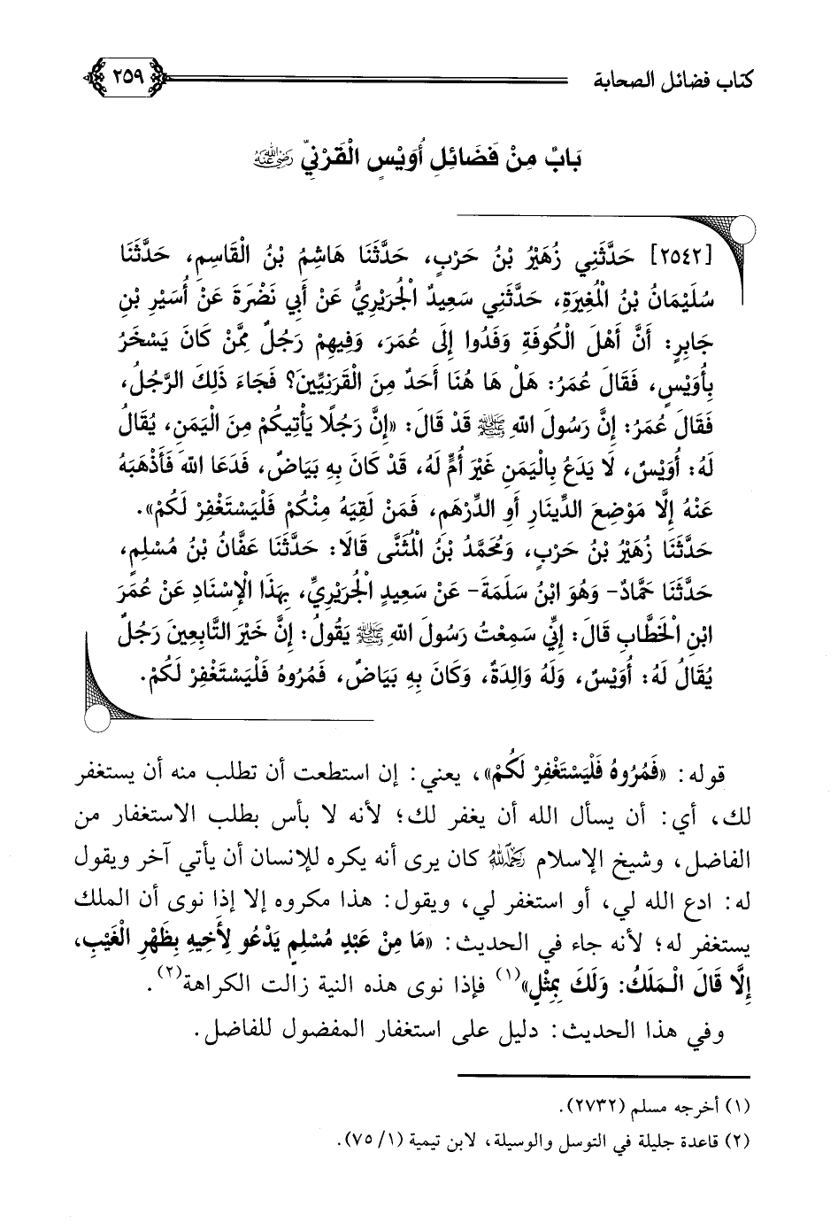 [٢٥٤٢] حَدَّثَنِي زُهَيْرُ بْنُ حَرْبٍ، حَدَّثَنَا هَاشِمُ بْنُ الْقَاسِمِ، حَدَّثَنَا سُلَيْمَانُ بْنُ الْمُغِيرَةِ، حَدَّثَنِي سَعِيدٌ الْجُرَيْرِيُّ عَنْ أَبِي نَضْرَةَ عَنْ أُسَيْرِ بْنِ جَابِرٍ: أَنَّ أَهْلَ الْكُوفَةِ وَفَدُوا إِلَى عُمَرَ، وَفِيهِمْ رَجُلٌ مِمَّنْ كَانَ يَسْخَرُ بِأُوَيْسٍ، فَقَالَ عُمَرُ: هَلْ هَا هُنَا أَحَدٌ مِنَ الْقَرَنِيِّينَ؟ فَجَاءَ ذَلِكَ الرَّجُلُ، فَقَالَ عُمَرُ: إِنَّ رَسُولَ اللَّهِ صلى الله عليه وسلم قَدْ قَالَ: ((إِنَّ رَجُلًا يَأْتِيكُمْ مِنْ الْيَمَنِ، يُقَالُ لَهُ: أُوَيْسٌ، لَا يَدَعُ بِالْيَمَنِ غَيْرَ أُمٍّ لَهُ، قَدْ كَانَ بِهِ بَيَاضٌ، فَدَعَا اللَّهَ فَأَذْهَبَهُ عَنْهُ إِلَّا مَوْضِعَ الدِّينَارِ أَوِ الدِّرْهَمِ، فَمَنْ لَقِيَهُ مِنْكُمْ فَلْيَسْتَغْفِرْ لَكُمْ)).