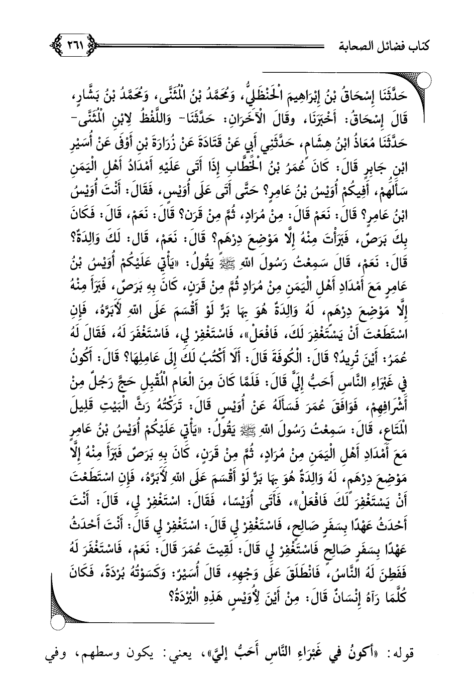مِنْ قَرَنٍ، كَانَ بِهِ بَرَصٌ فَبَرَأَ مِنْهُ إِلَّا مَوْضِعَ دِرْهَمٍ، لَهُ وَالِدَةٌ هُوَ بِهَا بَرٌّ لَوْ أَقْسَمَ عَلَى اللَّهِ لَأَبَرَّهُ، فَإِنِ اسْتَطَعْتَ أَنْ يَسْتَغْفِرَ لَكَ فَافْعَلْ))، فَأَتَى أُوَيْسًا، فَقَالَ: اسْتَغْفِرْ لِي قَالَ: أَنْتَ أَحْدَثُ عَهْدًا بِسَفَرٍ صَالِحٍ، فَاسْتَغْفِرْ لِي قَالَ: اسْتَغْفِرْ لِي قَالَ: أَنْتَ أَحْدَثُ عَهْدًا بِسَفَرٍ صَالِحٍ فَاسْتَغْفِرْ لِي قَالَ: لَقِيتَ عُمَرَ قَالَ: نَعَمْ، فَاسْتَغْفَرَ لَهُ فَفَطِنَ لَهُ النَّاسُ، فَانْطَلَقَ عَلَى وَجْهِهِ، قَالَ أُسَيْرٌ: وَكَسَوْتُهُ بُرْدَةً، فَكَانَ كُلَّمَا رَآهُ إِنْسَانٌ قَالَ: مِنْ أَيْنَ لِأُوَيْسٍ هَذِهِ الْبُرْدَةُ؟