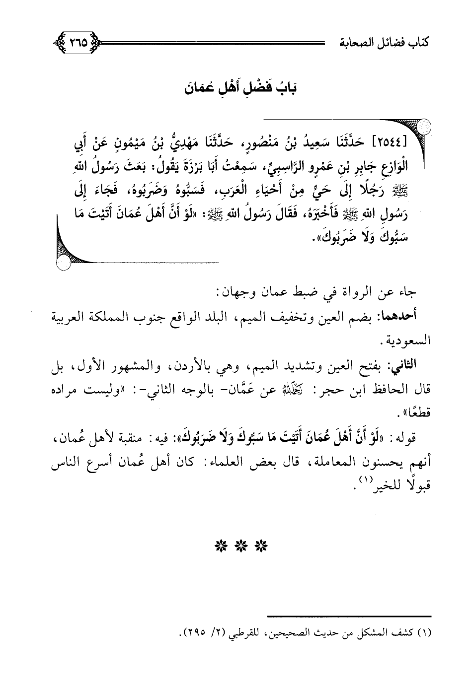 [٢٥٤٤] حَدَّثَنَا سَعِيدُ بْنُ مَنْصُورٍ، حَدَّثَنَا مَهْدِيُّ بْنُ مَيْمُونٍ عَنْ أَبِي الْوَازِعِ جَابِرِ بْنِ عَمْرٍو الرَّاسِبِيِّ، سَمِعْتُ أَبَا بَرْزَةَ يَقُولُ: بَعَثَ رَسُولُ اللَّهِ صلى الله عليه وسلم رَجُلًا إِلَى حَيٍّ مِنْ أَحْيَاءِ الْعَرَبِ، فَسَبُّوهُ وَضَرَبُوهُ، فَجَاءَ إِلَى رَسُولِ اللَّهِ صلى الله عليه وسلم فَأَخْبَرَهُ، فَقَالَ رَسُولُ اللَّهِ صلى الله عليه وسلم: ((لَوْ أَنَّ أَهْلَ عُمَانَ أَتَيْتَ مَا سَبُّوكَ وَلَا ضَرَبُوكَ)).