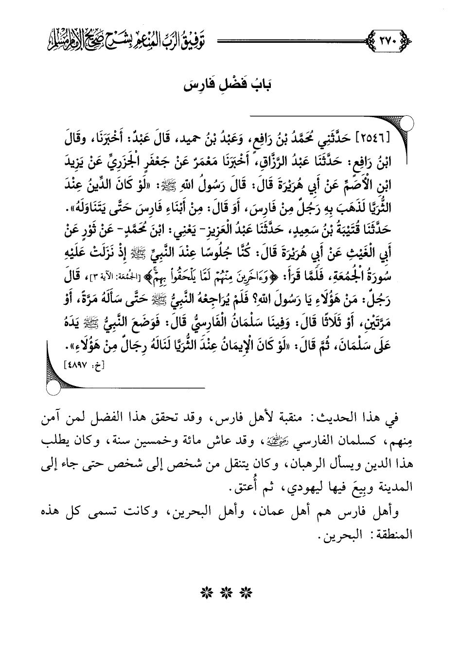 في هذا الحديث: منقبة لأهل فارس، وقد تحقق هذا الفضل لمن آمن مِنهم، كسلمان الفارسي رضي الله عنه، وقد عاش مائة وخمسين سنة، وكان يطلب هذا الدين ويسأل الرهبان، وكان يتنقل من شخص إلى شخص حتى جاء إلى المدينة وبِيعَ فيها ليهودي، ثم أُعتق.