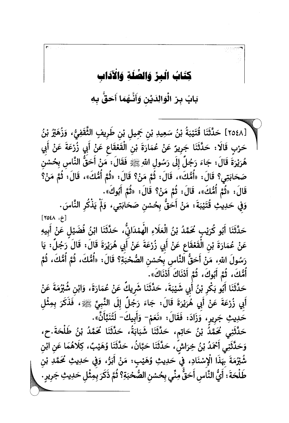 [٢٥٤٨] حَدَّثَنَا قُتَيْبَةُ بْنُ سَعِيدِ بْنِ جَمِيلِ بْنِ طَرِيفٍ الثَّقَفِيُّ، وَزُهَيْرُ بْنُ حَرْبٍ قَالَا: حَدَّثَنَا جَرِيرٌ عَنْ عُمَارَةَ بْنِ الْقَعْقَاعِ عَنْ أَبِي زُرْعَةَ عَنْ أَبِي هُرَيْرَةَ قَالَ: جَاءَ رَجُلٌ إِلَى رَسُولِ اللَّهِ صلى الله عليه وسلم فَقَالَ: مَنْ أَحَقُّ النَّاسِ بِحُسْنِ صَحَابَتِي؟ قَالَ: ((أُمُّكَ))، قَالَ: ثُمَّ مَنْ؟ قَالَ: ((ثُمَّ أُمُّكَ))، قَالَ: ثُمَّ مَنْ؟ قَالَ: ((ثُمَّ أُمُّكَ))، قَالَ: ثُمَّ مَنْ؟ قَالَ: ((ثُمَّ أَبُوكَ)).