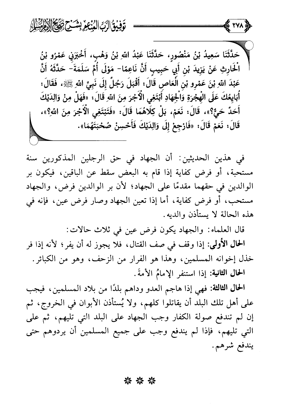 حَدَّثَنَا سَعِيدُ بْنُ مَنْصُورٍ، حَدَّثَنَا عَبْدُ اللَّهِ بْنُ وَهْبٍ، أَخْبَرَنِي عَمْرُو بْنُ الْحَارِثِ عَنْ يَزِيدَ بْنِ أَبِي حَبِيبٍ أَنَّ نَاعِمًا- مَوْلَى أُمِّ سَلَمَةَ- حَدَّثَهُ أَنَّ عَبْدَ اللَّهِ بْنَ عَمْرِو بْنِ الْعَاصِ قَالَ: أَقْبَلَ رَجُلٌ إِلَى نَبِيِّ اللَّهِ صلى الله عليه وسلم، فَقَالَ: أُبَايِعُكَ عَلَى الْهِجْرَةِ وَالْجِهَادِ أَبْتَغِي الْأَجْرَ مِنَ اللَّهِ قَالَ: ((فَهَلْ مِنْ وَالِدَيْكَ أَحَدٌ حَيٌّ؟ ))، قَالَ: نَعَمْ، بَلْ كِلَاهُمَا قَالَ: ((فَتَبْتَغِي الْأَجْرَ مِنَ اللَّهِ؟ ))، قَالَ: نَعَمْ قَالَ: ((فَارْجِعْ إِلَى وَالِدَيْكَ فَأَحْسِنْ صُحْبَتَهُمَا)).