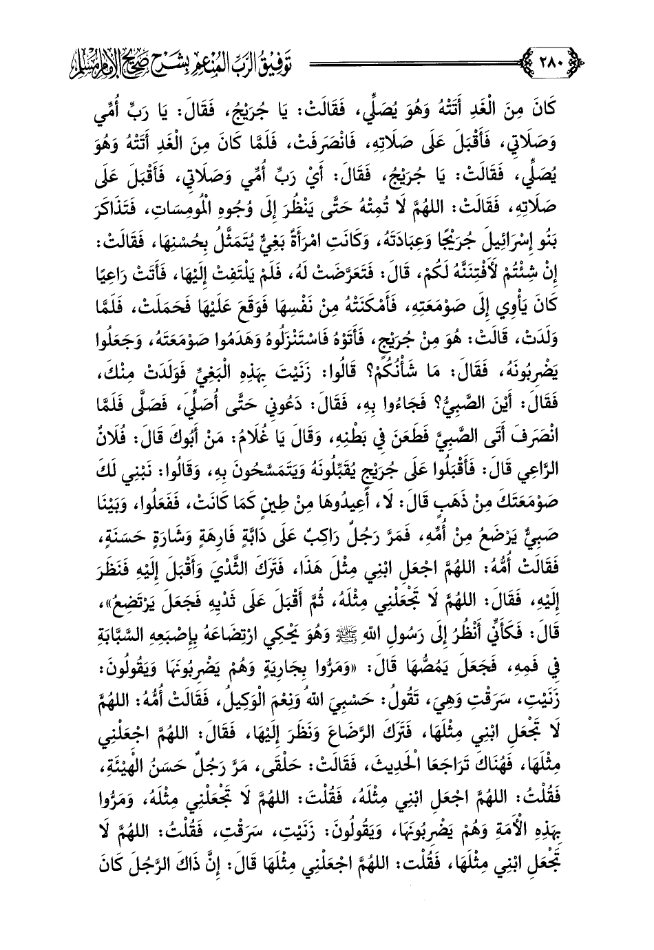 أُصَلِّيَ، فَصَلَّى فَلَمَّا انْصَرَفَ أَتَى الصَّبِيَّ فَطَعَنَ فِي بَطْنِهِ، وَقَالَ يَا غُلَامُ: مَنْ أَبُوكَ قَالَ: فُلَانٌ الرَّاعِي قَالَ: فَأَقْبَلُوا عَلَى جُرَيْجٍ يُقَبِّلُونَهُ وَيَتَمَسَّحُونَ بِهِ، وَقَالُوا: نَبْنِي لَكَ صَوْمَعَتَكَ مِنْ ذَهَبٍ قَالَ: لَا، أَعِيدُوهَا مِنْ طِينٍ كَمَا كَانَتْ، فَفَعَلُوا، وَبَيْنَا صَبِيٌّ يَرْضَعُ مِنْ أُمِّهِ، فَمَرَّ رَجُلٌ رَاكِبٌ عَلَى دَابَّةٍ فَارِهَةٍ وَشَارَةٍ حَسَنَةٍ، فَقَالَتْ أُمُّهُ: اللَّهُمَّ اجْعَلِ ابْنِي مِثْلَ هَذَا، فَتَرَكَ الثَّدْيَ وَأَقْبَلَ إِلَيْهِ فَنَظَرَ إِلَيْهِ، فَقَالَ: اللَّهُمَّ لَا تَجْعَلْنِي مِثْلَهُ، ثُمَّ أَقْبَلَ عَلَى ثَدْيِهِ فَجَعَلَ يَرْتَضِعُ))، قَالَ: فَكَأَنِّي أَنْظُرُ إِلَى رَسُولِ اللَّهِ صلى الله عليه وسلم وَهُوَ يَحْكِي ارْتِضَاعَهُ بِإِصْبَعِهِ السَّبَّابَةِ فِي فَمِهِ، فَجَعَلَ يَمُصُّهَا قَالَ: ((وَمَرُّوا بِجَارِيَةٍ وَهُمْ يَضْرِبُونَهَا وَيَقُولُونَ: زَنَيْتِ، سَرَقْتِ وَهِيَ، تَقُولُ: حَسْبِيَ اللَّهُ وَنِعْمَ الْوَكِيلُ، فَقَالَتْ أُمُّهُ: اللَّهُمَّ لَا تَجْعَلِ ابْنِي مِثْلَهَا، فَتَرَكَ الرَّضَاعَ وَنَظَرَ إِلَيْهَا، فَقَالَ: اللَّهُمَّ اجْعَلْنِي مِثْلَهَا، فَهُنَاكَ تَرَاجَعَا الْحَدِيثَ، فَقَالَتْ: حَلْقَى، مَرَّ رَجُلٌ حَسَنُ الْهَيْئَةِ، فَقُلْتُ: اللَّهُمَّ اجْعَلِ ابْنِي مِثْلَهُ، فَقُلْتَ: اللَّهُمَّ لَا تَجْعَلْنِي مِثْلَهُ، وَمَرُّوا بِهَذِهِ الْأَمَةِ وَهُمْ يَضْرِبُونَهَا، وَيَقُولُونَ: زَنَيْتِ، سَرَقْتِ، فَقُلْتُ: اللَّهُمَّ لَا تَجْعَلِ ابْنِي مِثْلَهَا، فَقُلْت: اللَّهُمَّ اجْعَلْنِي مِثْلَهَا قَالَ: إِنَّ ذَاكَ الرَّجُلَ كَانَ