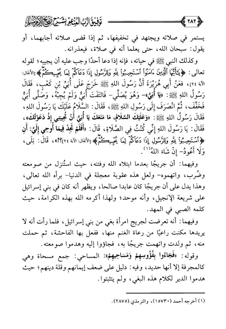 وكذلك النبي صلى الله عليه وسلم في حياته، فإنه إذا دعا أحدًا وجب عليه أن يجيبه؛ لقوله تعالى: {يا أيها الذين آمنوا استجيبوا لله وللرسول إذا دعاكم لما يحييكم}، فعَنْ أَبِي هُرَيْرَةَ أَنَّ رَسُولَ اللهِ صَلَّى اللَّهُ عَلَيْهِ وَسَلَّمَ خَرَجَ عَلَى أُبَيِّ بْنِ كَعْبٍ، فَقَالَ رَسُولُ اللهِ صَلَّى اللَّهُ عَلَيْهِ وَسَلَّمَ: ((يَا أُبَيُّ- وَهُوَ يُصَلِّي- فَالتَفَتَ أُبَيٌّ وَلَمْ يُجِبْهُ، وَصَلَّى أُبَيٌّ فَخَفَّفَ، ثُمَّ انْصَرَفَ إِلَى رَسُولِ اللهِ صَلَّى اللَّهُ عَلَيْهِ وَسَلَّمَ، فَقَالَ: السَّلامُ عَلَيْكَ يَا رَسُولَ اللهِ، فَقَالَ رَسُولُ اللهِ صَلَّى اللَّهُ عَلَيْهِ وَسَلَّمَ: وَعَلَيْكَ السَّلامُ، مَا مَنَعَكَ يَا أُبَيُّ أَنْ تُجِيبَنِي إِذْ دَعَوْتُكَ، فَقَالَ: يَا رَسُولَ اللهِ إِنِّي كُنْتُ فِي الصَّلاةِ، قَالَ: أَفَلَمْ تَجِدْ فِيمَا أُوحِي إِلَيَّ: أَنِ {اسْتَجِيبُوا لِلَّهِ وَلِلرَّسُولِ إِذَا دَعَاكُمْ لِمَا يُحْيِيكُمْ}؟ ! قَالَ: بَلَى، وَلا أَعُودُ- إِنْ شَاءَ اللَّهُ)) (¬١).