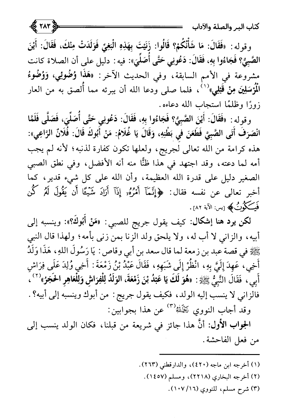 لكن يرد هنا إشكال: كيف يقول جريج للصبي: ((مَنْ أَبُوكَ؟ )): وينسبه إلى أبيه، والزاني لا أب له، ولا يلحق ولد الزنا بمن زنى بأمه؛ ولهذا قال النبي صلى الله عليه وسلم في قصة عبد بن زمعة لما قال سعد بن أبي وقاص: يَا رَسُولَ اللهِ، هَذَا وَلَدُ أَخِي، عَهِدَ إِلَيَّ بِهِ، انْظُرْ إِلَى شَبَهِهِ، فَقَالَ عَبْدُ بْنُ زَمْعَةَ: أَخِي وُلِدَ عَلَى فِرَاشِ أَبِي، فَقَالَ النَّبِيُّ صلى الله عليه وسلم: ((هُوَ لَكَ يَا عَبْدُ بْنَ زَمْعَةَ، الوَلَدُ لِلْفِرَاشِ وَلِلْعَاهِرِ الحَجَرُ)) (¬٢)، فالزاني لا ينسب إليه الولد، فكيف يقول جريج: من أبوك وينسبه إلى أبيه؟ .