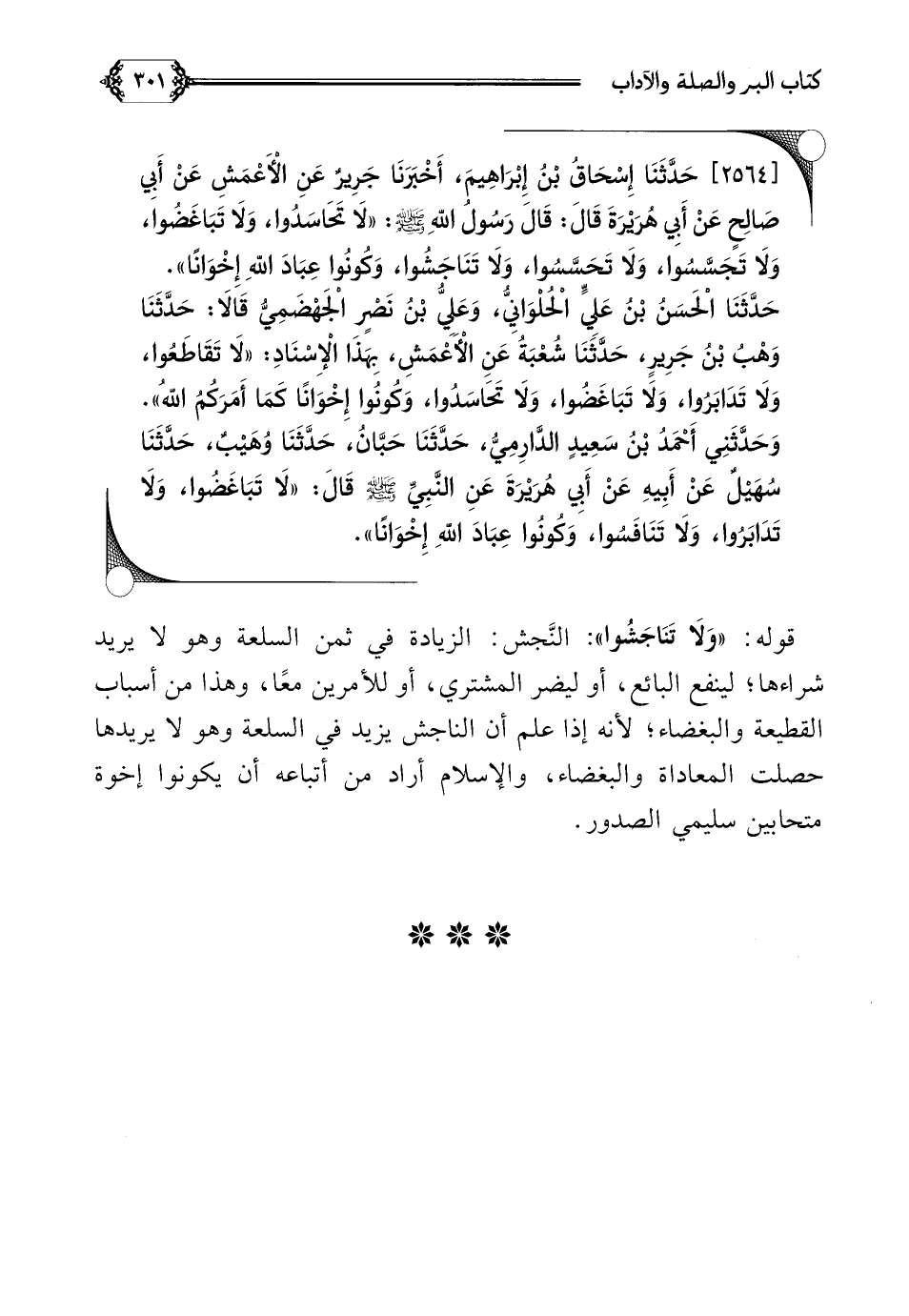 [٢٥٦٤] حَدَّثَنَا إِسْحَاقُ بْنُ إِبْرَاهِيمَ، أَخْبَرَنَا جَرِيرٌ عَنِ الْأَعْمَشِ عَنْ أَبِي صَالِحٍ عَنْ أَبِي هُرَيْرَةَ قَالَ: قَالَ رَسُولُ اللَّهِ صلى الله عليه وسلم: ((لَا تَحَاسَدُوا، وَلَا تَبَاغَضُوا، وَلَا تَجَسَّسُوا، وَلَا تَحَسَّسُوا، وَلَا تَنَاجَشُوا وَكُونُوا عِبَادَ اللَّهِ إِخْوَانًا)).