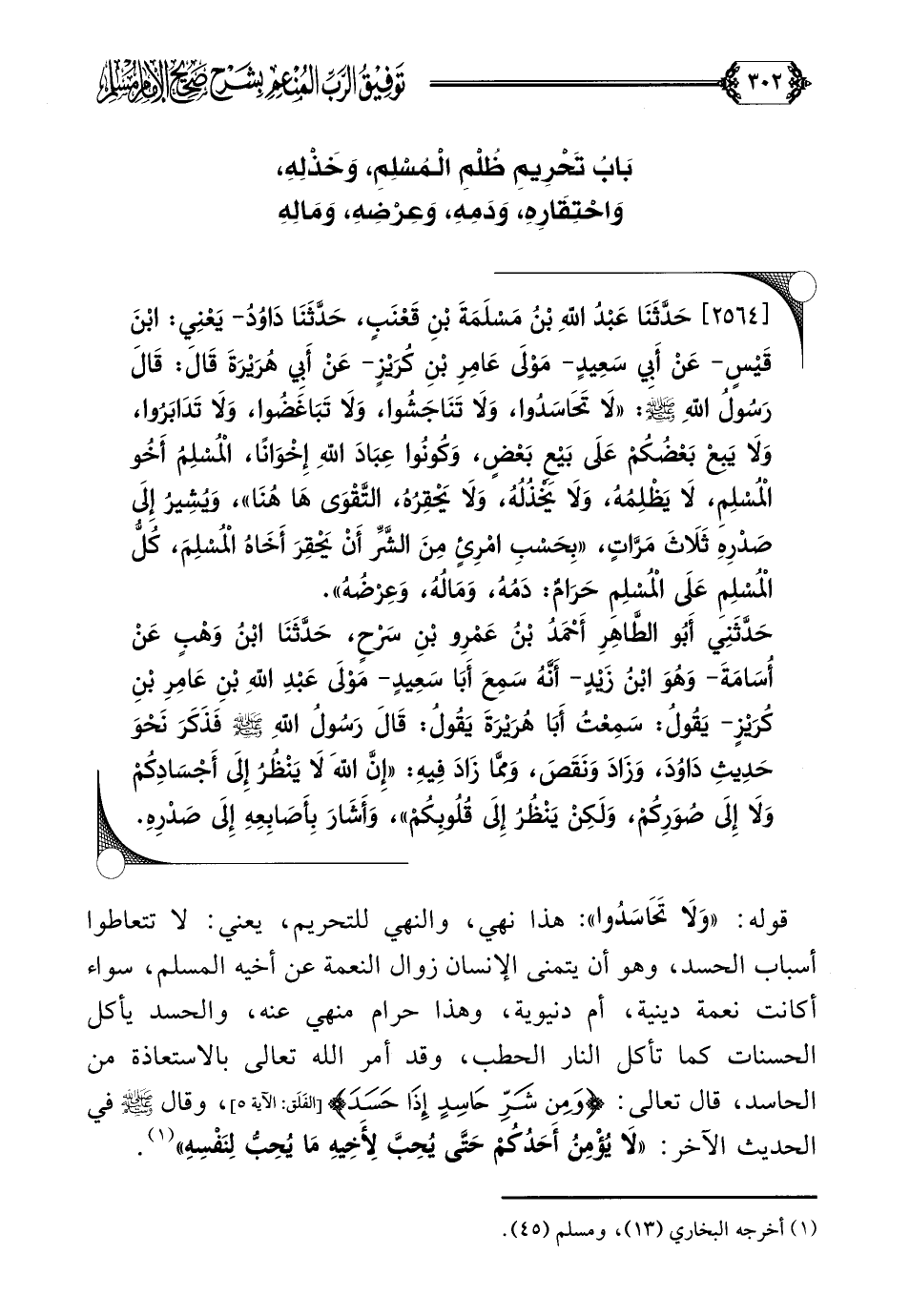 [٢٥٦٤] حَدَّثَنَا عَبْدُ اللَّهِ بْنُ مَسْلَمَةَ بْنِ قَعْنَبٍ، حَدَّثَنَا دَاوُدُ- يَعْنِي: ابْنَ قَيْسٍ- عَنْ أَبِي سَعِيدٍ- مَوْلَى عَامِرِ بْنِ كُرَيْزٍ- عَنْ أَبِي هُرَيْرَةَ قَالَ: قَالَ رَسُولُ اللَّهِ صلى الله عليه وسلم: ((لَا تَحَاسَدُوا، وَلَا تَنَاجَشُوا، وَلَا تَبَاغَضُوا، وَلَا تَدَابَرُوا، وَلَا يَبِعْ بَعْضُكُمْ عَلَى بَيْعِ بَعْضٍ، وَكُونُوا عِبَادَ اللَّهِ إِخْوَانًا، الْمُسْلِمُ أَخُو الْمُسْلِمِ، لَا يَظْلِمُهُ، وَلَا يَخْذُلُهُ، وَلَا يَحْقِرُهُ، التَّقْوَى هَا هُنَا))، وَيُشِيرُ إِلَى صَدْرِهِ ثَلَاثَ مَرَّاتٍ، ((بِحَسْبِ امْرِئٍ مِنَ الشَّرِّ أَنْ يَحْقِرَ أَخَاهُ الْمُسْلِمَ، كُلُّ الْمُسْلِمِ عَلَى الْمُسْلِمِ حَرَامٌ: دَمُهُ، وَمَالُهُ، وَعِرْضُهُ)).