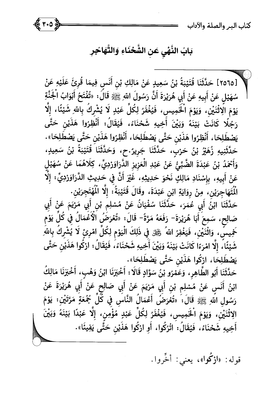 [٢٥٦٥] حَدَّثَنَا قُتَيْبَةُ بْنُ سَعِيدٍ عَنْ مَالِكِ بْنِ أَنَسٍ فِيمَا قُرِئَ عَلَيْهِ عَنْ سُهَيْلٍ عَنْ أَبِيهِ عَنْ أَبِي هُرَيْرَةَ أَنَّ رَسُولَ اللَّهِ صلى الله عليه وسلم قَالَ: ((تُفْتَحُ أَبْوَابُ الْجَنَّةِ يَوْمَ الِاثْنَيْنِ، وَيَوْمَ الْخَمِيسِ، فَيُغْفَرُ لِكُلِّ عَبْدٍ لَا يُشْرِكُ بِاللَّهِ شَيْئًا، إِلَّا رَجُلًا كَانَتْ بَيْنَهُ وَبَيْنَ أَخِيهِ شَحْنَاءُ، فَيُقَالُ: أَنْظِرُوا هَذَيْنِ حَتَّى يَصْطَلِحَا، أَنْظِرُوا هَذَيْنِ حَتَّى يَصْطَلِحَا، أَنْظِرُوا هَذَيْنِ حَتَّى يَصْطَلِحَا)).