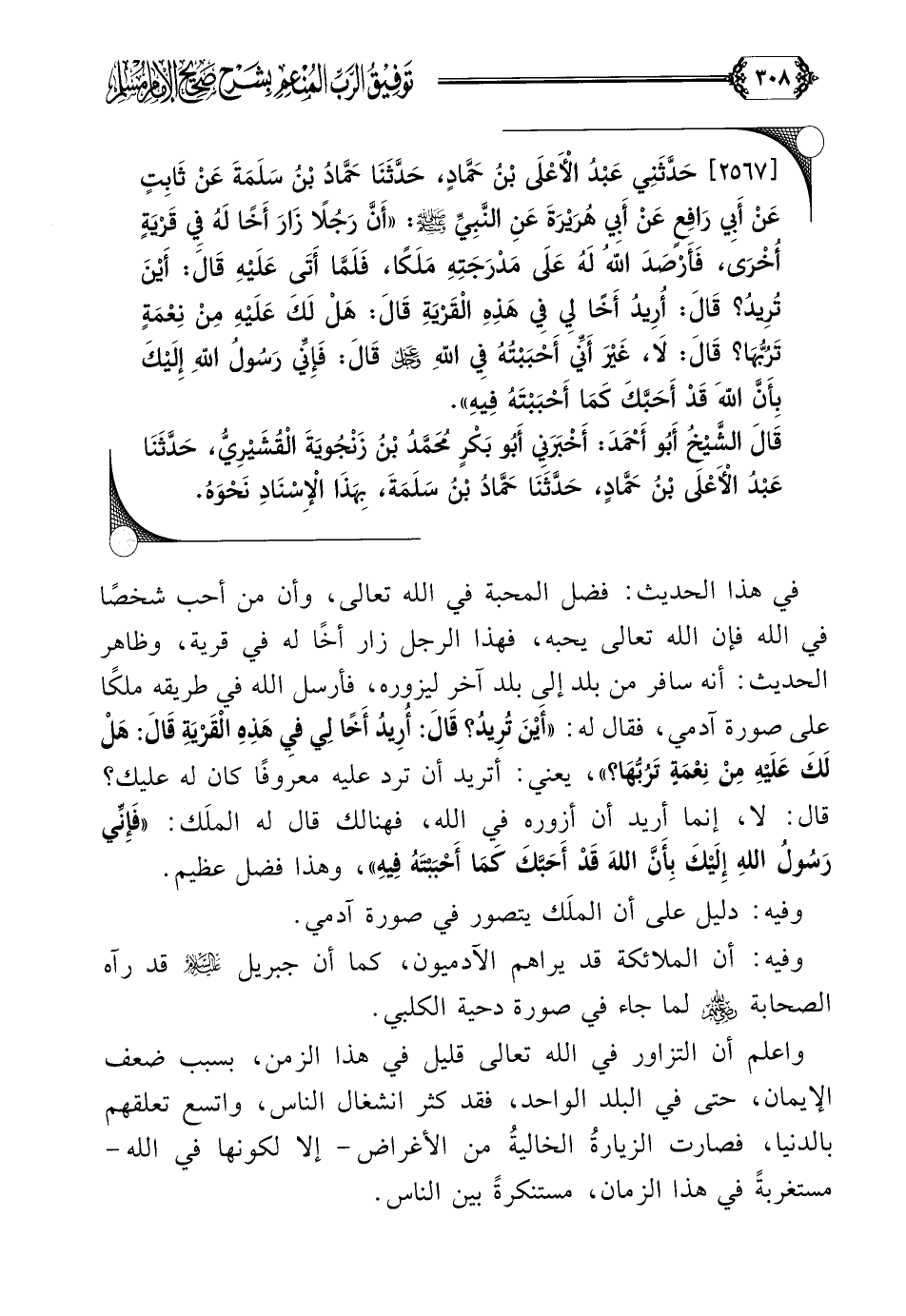 [٢٥٦٧] حَدَّثَنِي عَبْدُ الْأَعْلَى بْنُ حَمَّادٍ، حَدَّثَنَا حَمَّادُ بْنُ سَلَمَةَ عَنْ ثَابِتٍ عَنْ أَبِي رَافِعٍ عَنْ أَبِي هُرَيْرَةَ عَنِ النَّبِيِّ صلى الله عليه وسلم: ((أَنَّ رَجُلًا زَارَ أَخًا لَهُ فِي قَرْيَةٍ أُخْرَى، فَأَرْصَدَ اللَّهُ لَهُ عَلَى مَدْرَجَتِهِ مَلَكًا، فَلَمَّا أَتَى عَلَيْهِ قَالَ: أَيْنَ تُرِيدُ؟ قَالَ: أُرِيدُ أَخًا لِي فِي هَذِهِ الْقَرْيَةِ قَالَ: هَلْ لَكَ عَلَيْهِ مِنْ نِعْمَةٍ تَرُبُّهَا؟ قَالَ: لَا، غَيْرَ أَنِّي أَحْبَبْتُهُ فِي اللَّهِ عز وجل قَالَ: فَإِنِّي رَسُولُ اللَّهِ إِلَيْكَ بِأَنَّ اللَّهَ قَدْ أَحَبَّكَ كَمَا أَحْبَبْتَهُ فِيهِ)).
