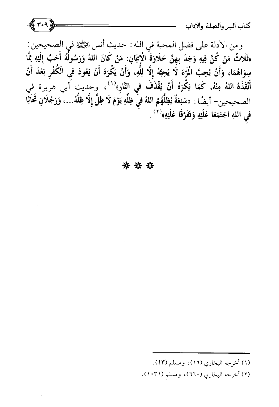 ومن الأدلة على فضل المحبة في الله: حديث أنس رضي الله عنه في الصحيحين: ((ثَلَاثٌ مَنْ كُنَّ فِيهِ وَجَدَ بِهِنَّ حَلَاوَةَ الْإِيمَانِ: مَنْ كَانَ اللهُ وَرَسُولُهُ أَحَبَّ إِلَيْهِ مِمَّا سِوَاهُمَا، وَأَنْ يُحِبَّ الْمَرْءَ لَا يُحِبُّهُ إِلَّا لِلَّهِ، وَأَنْ يَكْرَهَ أَنْ يَعُودَ فِي الْكُفْرِ بَعْدَ أَنْ أَنْقَذَهُ اللهُ مِنْهُ، كَمَا يَكْرَهُ أَنْ يُقْذَفَ فِي النَّارِ)) (¬١)، وحديث أبي هريرة في الصحيحين- أيضا: ((سَبْعَةٌ يُظِلُّهُمُ اللهُ فِي ظِلِّهِ يَوْمَ لَا ظِلَّ إِلَّا ظِلُّهُ))، وذكر منهم: ((وَرَجُلَانِ تَحَابَّا فِي اللهِ اجْتَمَعَا عَلَيْهِ وَتَفَرَّقَا عَلَيْهِ)) (¬٢).