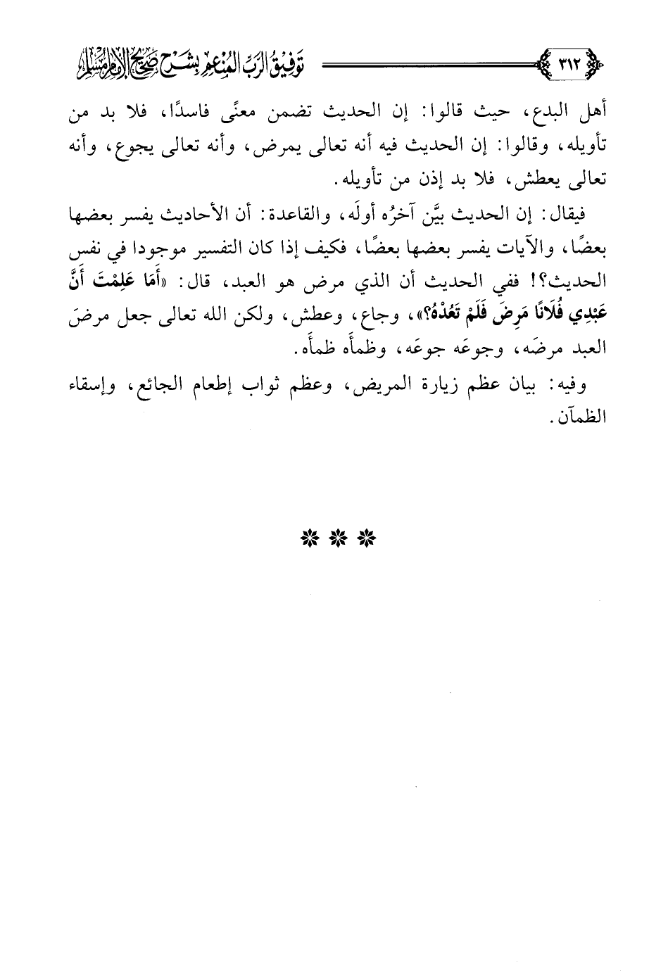 فيقال: إن الحديث بيَّن آخرُه أولَه، والقاعدة: أن الأحاديث يفسر بعضها بعضًا، والآيات يفسر بعضها بعضًا، فكيف إذا كان التفسير موجودا في نفس الحديث؟ ! ففي الحديث أن الذي مرض هو العبد، قال: ((أَمَا عَلِمْتَ أَنَّ عَبْدِي فُلَانًا مَرِضَ فَلَمْ تَعُدْهُ؟ ))، وجاع، وعطش، ولكن الله تعالى جعل مرضَ العبد مرضَه، وجوعَه جوعَه، وظمأَه ظمأَه.