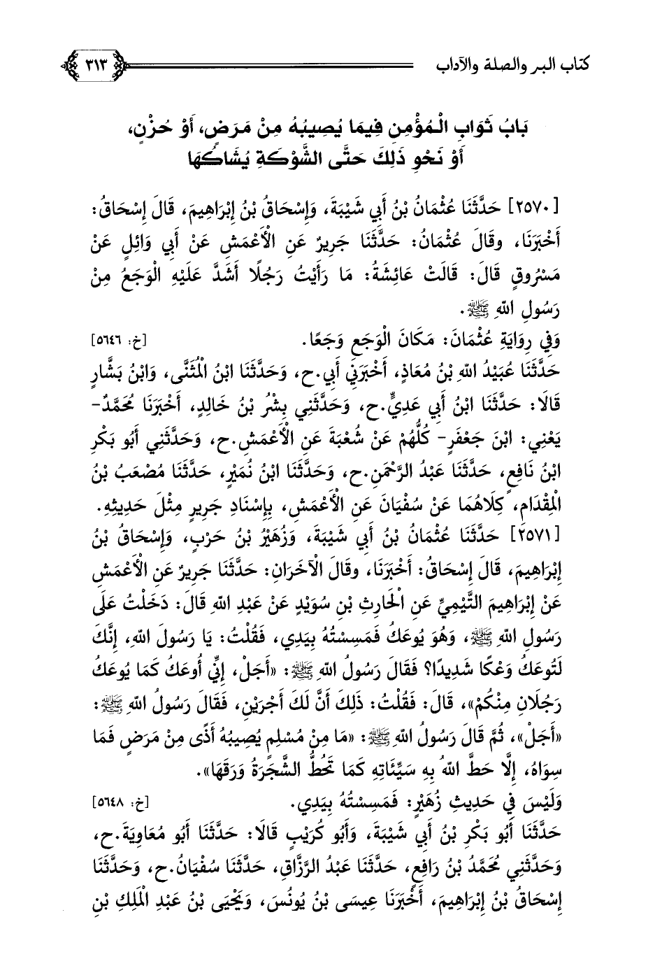 [٢٥٧٠] حَدَّثَنَا عُثْمَانُ بْنُ أَبِي شَيْبَةَ، وَإِسْحَاقُ بْنُ إِبْرَاهِيمَ، قَالَ إِسْحَاقُ: أَخْبَرَنَا، وقَالَ عُثْمَانُ: حَدَّثَنَا جَرِيرٌ عَنِ الْأَعْمَشِ عَنْ أَبِي وَائِلٍ عَنْ مَسْرُوقٍ قَالَ: قَالَتْ عَائِشَةُ: مَا رَأَيْتُ رَجُلًا أَشَدَّ عَلَيْهِ الْوَجَعُ مِنْ رَسُولِ اللَّهِ صلى الله عليه وسلم.