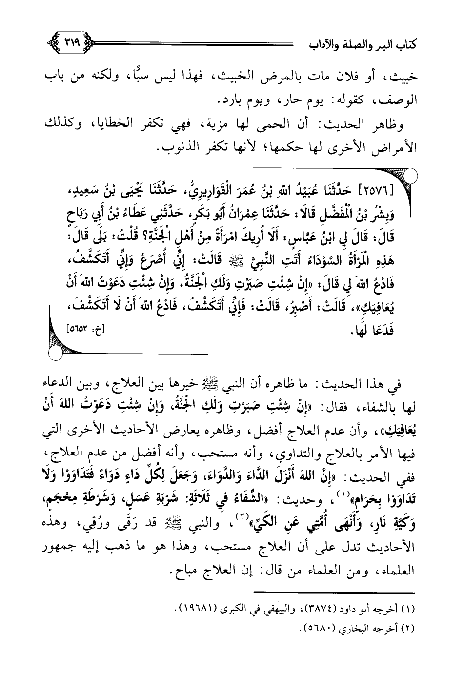 في هذا الحديث: ما ظاهره أن النبي صلى الله عليه وسلم خيرها بين العلاج، وبين الدعاء لها بالشفاء، فقال: ((إِنْ شِئْتِ صَبَرْتِ وَلَكِ الْجَنَّةُ، وَإِنْ شِئْتِ دَعَوْتُ اللَّهَ أَنْ يُعَافِيَكِ))، وأن عدم العلاج أفضل، وظاهره يعارض الأحاديث الأخرى التي فيها الأمر بالعلاج والتداوي، وأنه مستحب، وأنه أفضل من عدم العلاج، ففي الحديث: ((إِنَّ اللَّهَ أَنْزَلَ الدَّاءَ وَالدَّوَاءَ، وَجَعَلَ لِكُلِّ دَاءٍ دَوَاءً فَتَدَاوَوْا وَلَا تَدَاوَوْا بِحَرَامٍ)) (¬١)، وحديث: ((الشِّفَاءُ فِي ثَلاثَةٍ: شَرْبَةِ عَسَلٍ، وَشَرْطَةِ مِحْجَمٍ، وَكَيَّةِ نَارٍ، وَأَنْهَى أُمَّتِي عَنِ الكَيِّ)) (¬٢)، والنبي صلى الله عليه وسلم قد رَقَى ورُقِي، وهذه الأحاديث تدل على أن العلاج مستحب، وهذا هو ما ذهب إليه جمهور العلماء، ومن العلماء من قال: إن العلاج مباح.