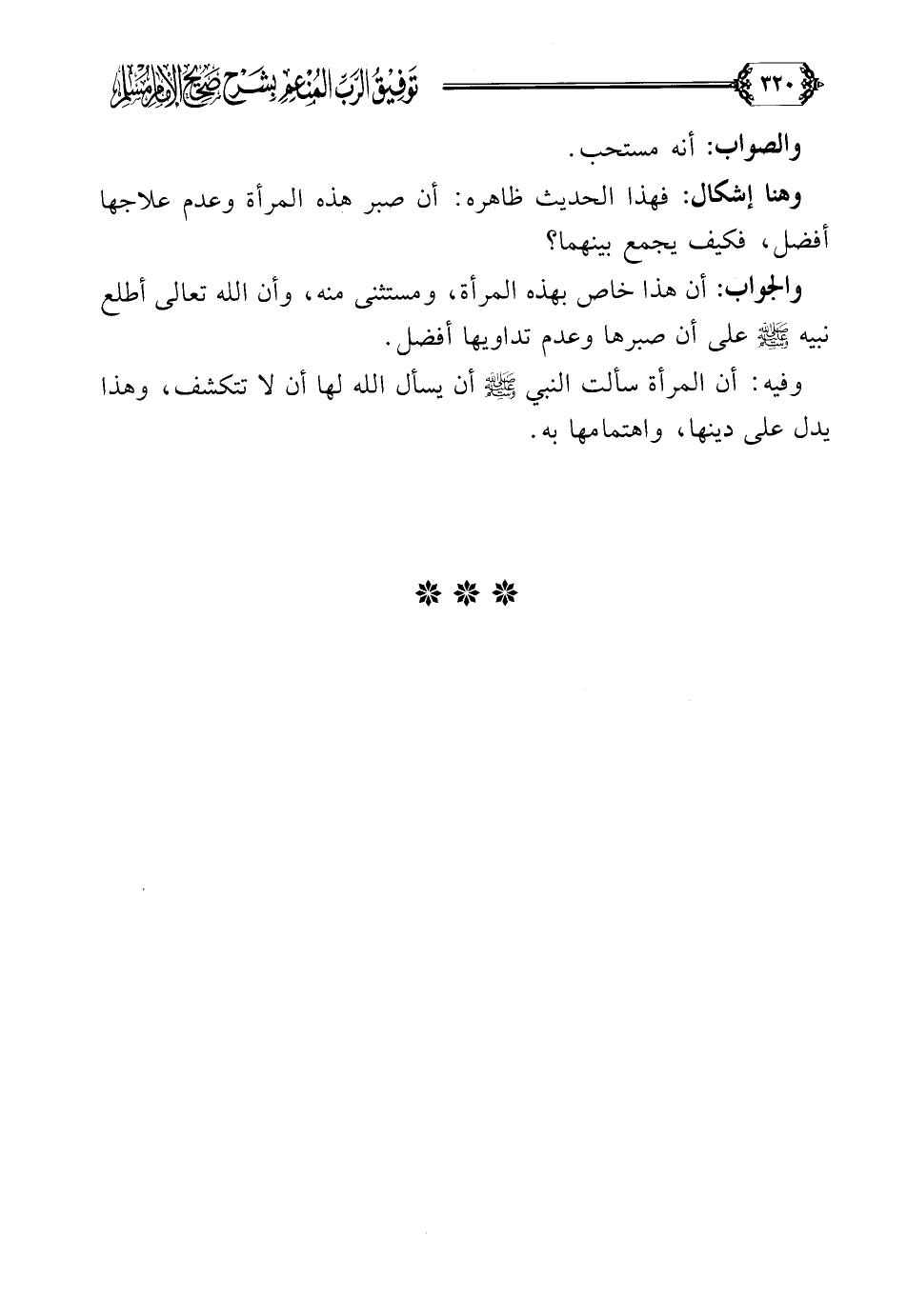 والجواب: أن هذا خاص بهذه المرأة، ومستثنى منه، وأن الله تعالى أطلع نبيه صلى الله عليه وسلم على أن صبرها وعدم تداويها أفضل.