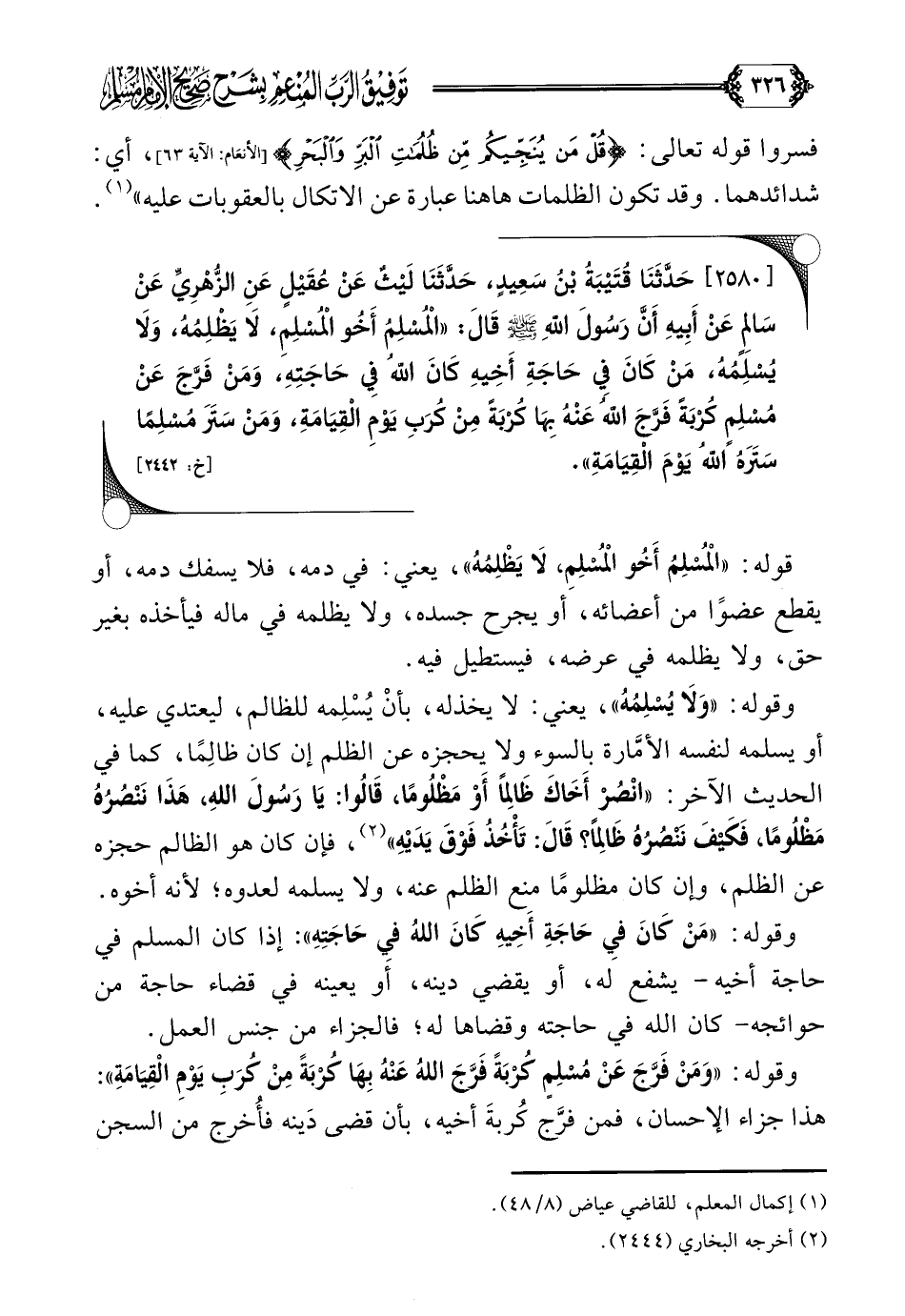 [٢٥٨٠] حَدَّثَنَا قُتَيْبَةُ بْنُ سَعِيدٍ، حَدَّثَنَا لَيْثٌ عَنْ عُقَيْلٍ عَنِ الزُّهْرِيِّ عَنْ سَالِمٍ عَنْ أَبِيهِ أَنَّ رَسُولَ اللَّهِ صلى الله عليه وسلم قَالَ: ((الْمُسْلِمُ أَخُو الْمُسْلِمِ، لَا يَظْلِمُهُ، وَلَا يُسْلِمُهُ، مَنْ كَانَ فِي حَاجَةِ أَخِيهِ كَانَ اللَّهُ فِي حَاجَتِهِ، وَمَنْ فَرَّجَ عَنْ مُسْلِمٍ كُرْبَةً فَرَّجَ اللَّهُ عَنْهُ بِهَا كُرْبَةً مِنْ كُرَبِ يَوْمِ الْقِيَامَةِ، وَمَنْ سَتَرَ مُسْلِمًا سَتَرَهُ اللَّهُ يَوْمَ الْقِيَامَةِ)).