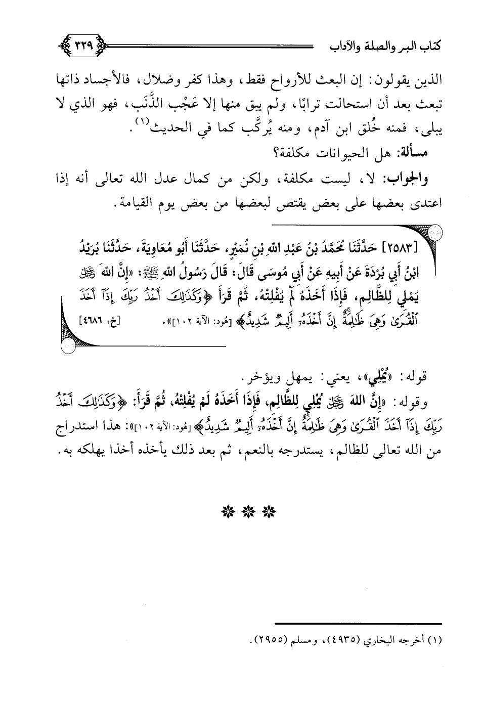 [٢٥٨٣] حَدَّثَنَا مُحَمَّدُ بْنُ عَبْدِ اللَّهِ بْنِ نُمَيْرٍ، حَدَّثَنَا أَبُو مُعَاوِيَةَ، حَدَّثَنَا بُرَيْدُ بْنُ أَبِي بُرْدَةَ عَنْ أَبِيهِ عَنْ أَبِي مُوسَى قَالَ: قَالَ رَسُولُ اللَّهِ صلى الله عليه وسلم: ((إِنَّ اللَّهَ عز وجل يُمْلِي لِلظَّالِمِ، فَإِذَا أَخَذَهُ لَمْ يُفْلِتْهُ، ثُمَّ قَرَأَ {وَكَذَلِكَ أَخْذُ رَبِّكَ إِذَا أَخَذَ الْقُرَى وَهِيَ ظَالِمَةٌ إِنَّ أَخْذَهُ أَلِيمٌ شَدِيدٌ})).