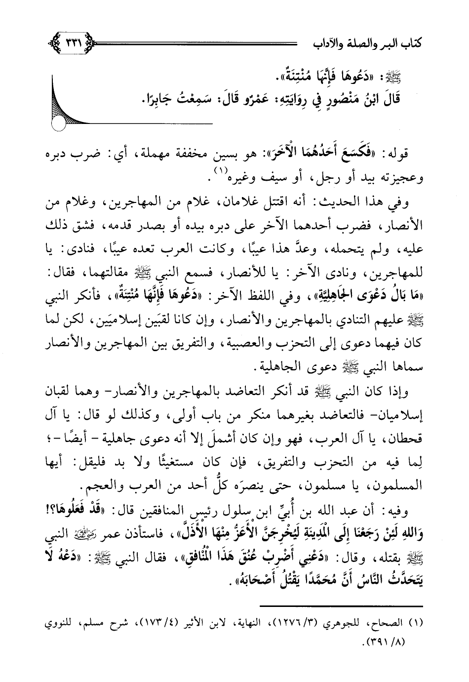 وفي هذا الحديث: أنه اقتتل غلامان، غلام من المهاجرين، وغلام من الأنصار، فضرب أحدهما الآخر على دبره بيده أو بصدر قدمه، فشق ذلك عليه، ولم يتحمله، وعدَّ هذا عيبًا، وكانت العرب تعده عيبًا، فنادى: يا للمهاجرين، ونادى الآخر: يا للأنصار، فسمع النبي صلى الله عليه وسلم مقالتهما، فقال: ((مَا بَالُ دَعْوَى الجَاهِلِيَّةِ))، وفي اللفظ الآخر: ((دَعُوهَا فَإِنَّهَا مُنْتِنَةٌ))، فأنكر النبي صلى الله عليه وسلم عليهم التنادي بالمهاجرين والأنصار، وإن كانا لقبَين إسلاميَين، لكن لما كان فيهما دعوى إلى التحزب والعصبية، والتفريق بين المهاجرين والأنصار سماها النبي صلى الله عليه وسلم دعوى الجاهلية.